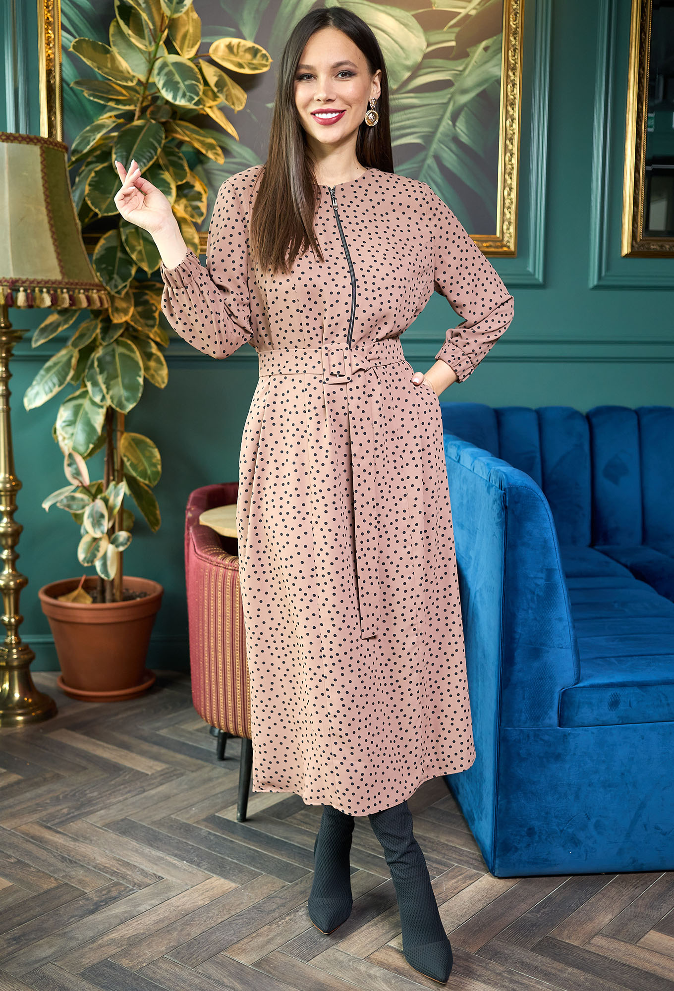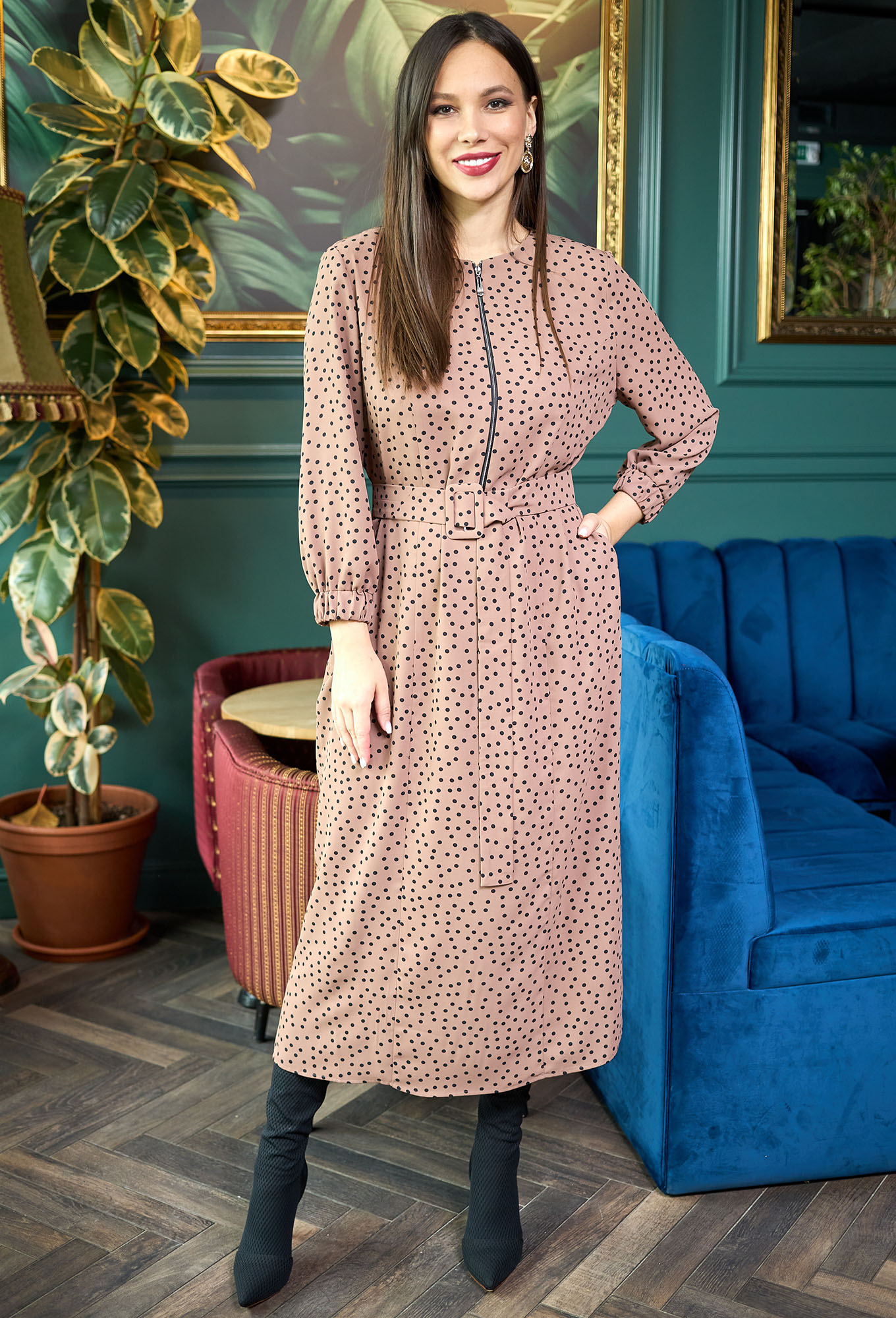 Платье выполнено из ткани с набивным рисунком «горох», костюмно-плательной группы. Платье длиной ниже колена, прямого силуэта. Перед с центральной застежкой на молнию до линии талии и вертикальными рельефами. Спинка цельная. Горловина круглой формы. Рукав, длиной 3/4, по низу на притачной манжете на резинке. В боковых швах платья выполнены карманы. Платье со съемным поясом на пряжке.