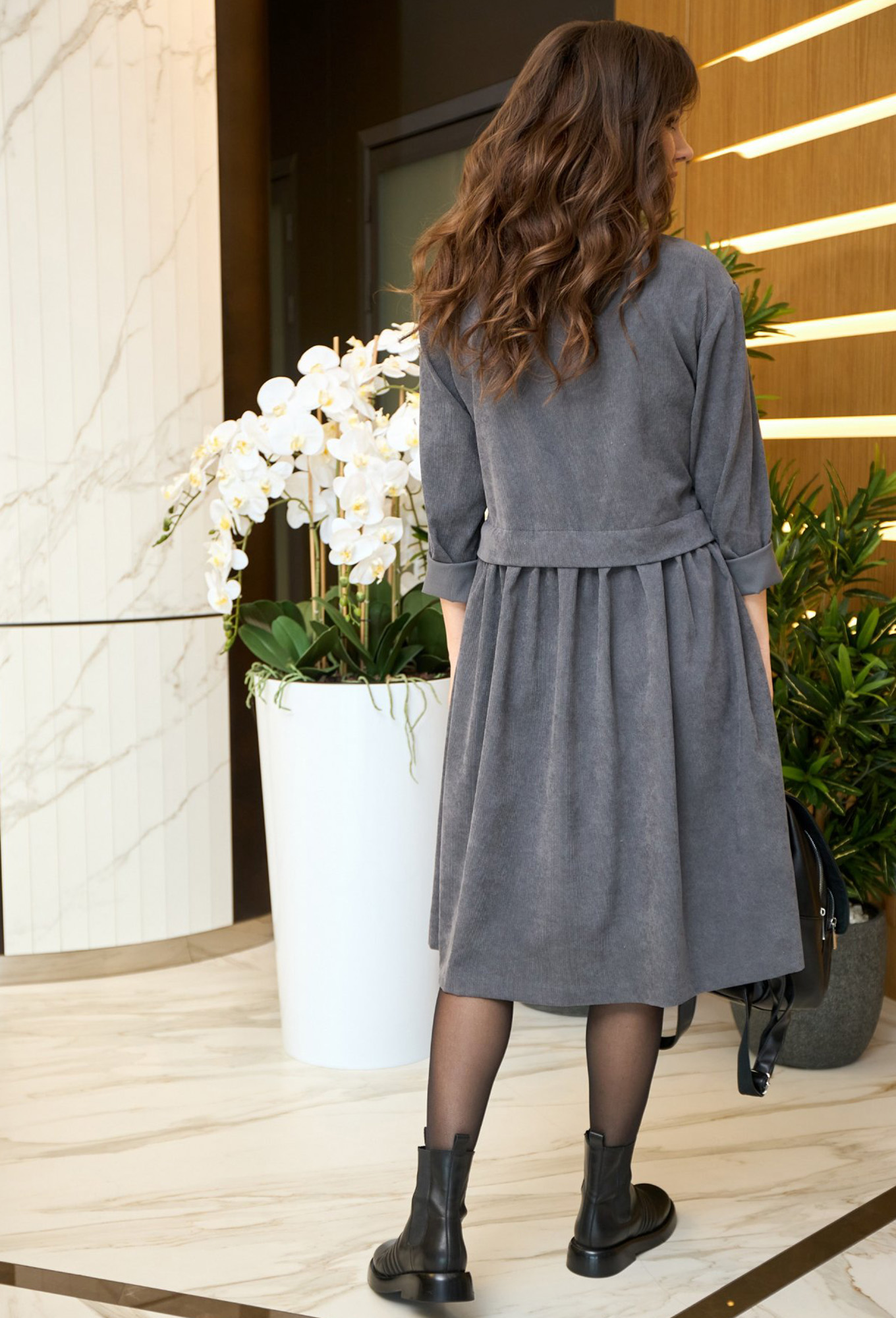 Платье прямого силуэта, длиной за колено, выполнено из вельвета в мелкий рубчик. Полочка платья с отрезной планкой по центру и застежкой на петли и пуговицы. Лиф платья отрезной, со складкой по низу, к срезу которой притачана юбка со сборкой. Полочка лифа с нагрудными вытачками и накладными карманами. Горловина круглой формы обработана воротником-стойкой. Пройма углубленной формы с рукавом рубашечного типа, рукав длинный, одношовный. В боковых швах юбки обработаны карманы.