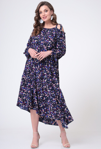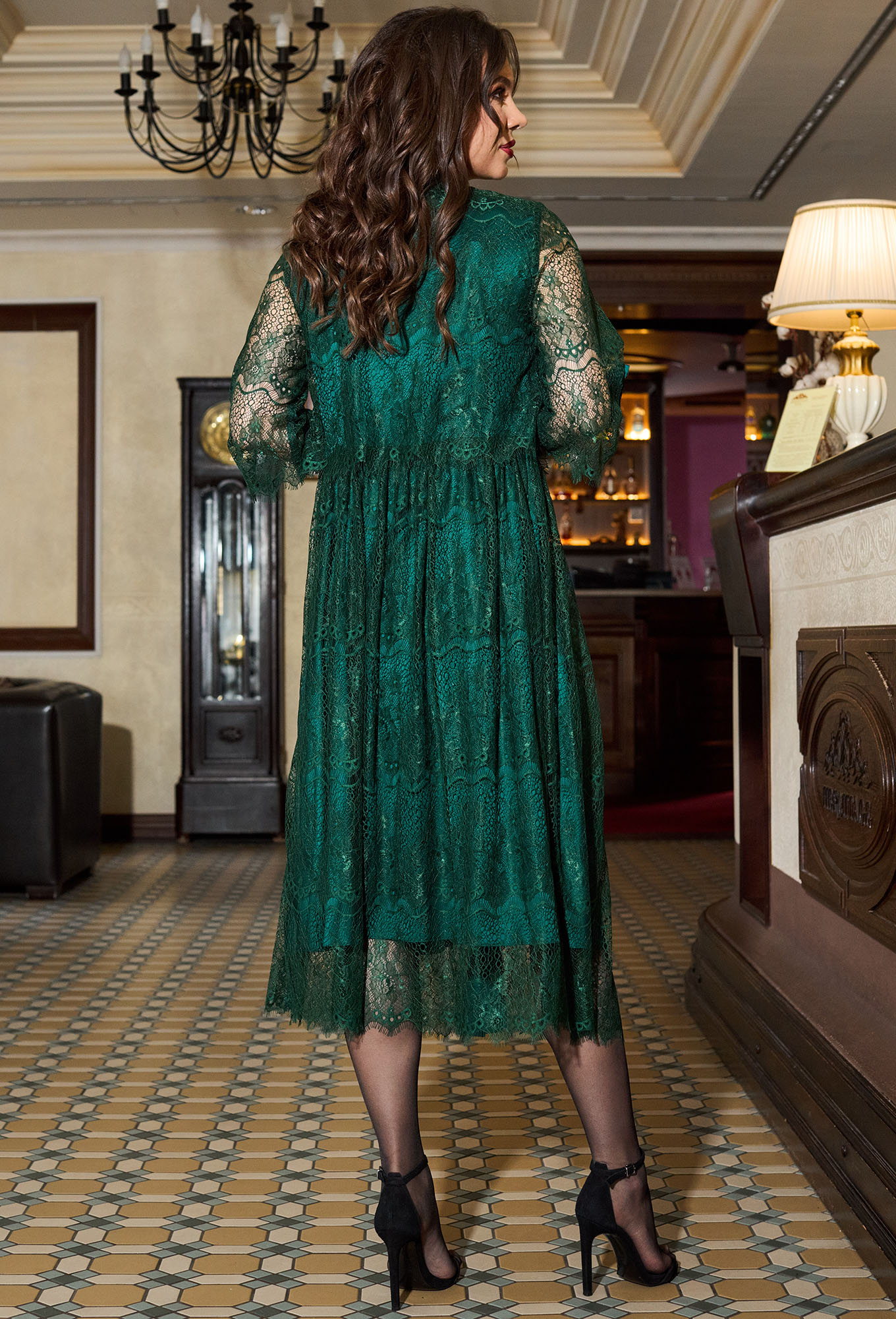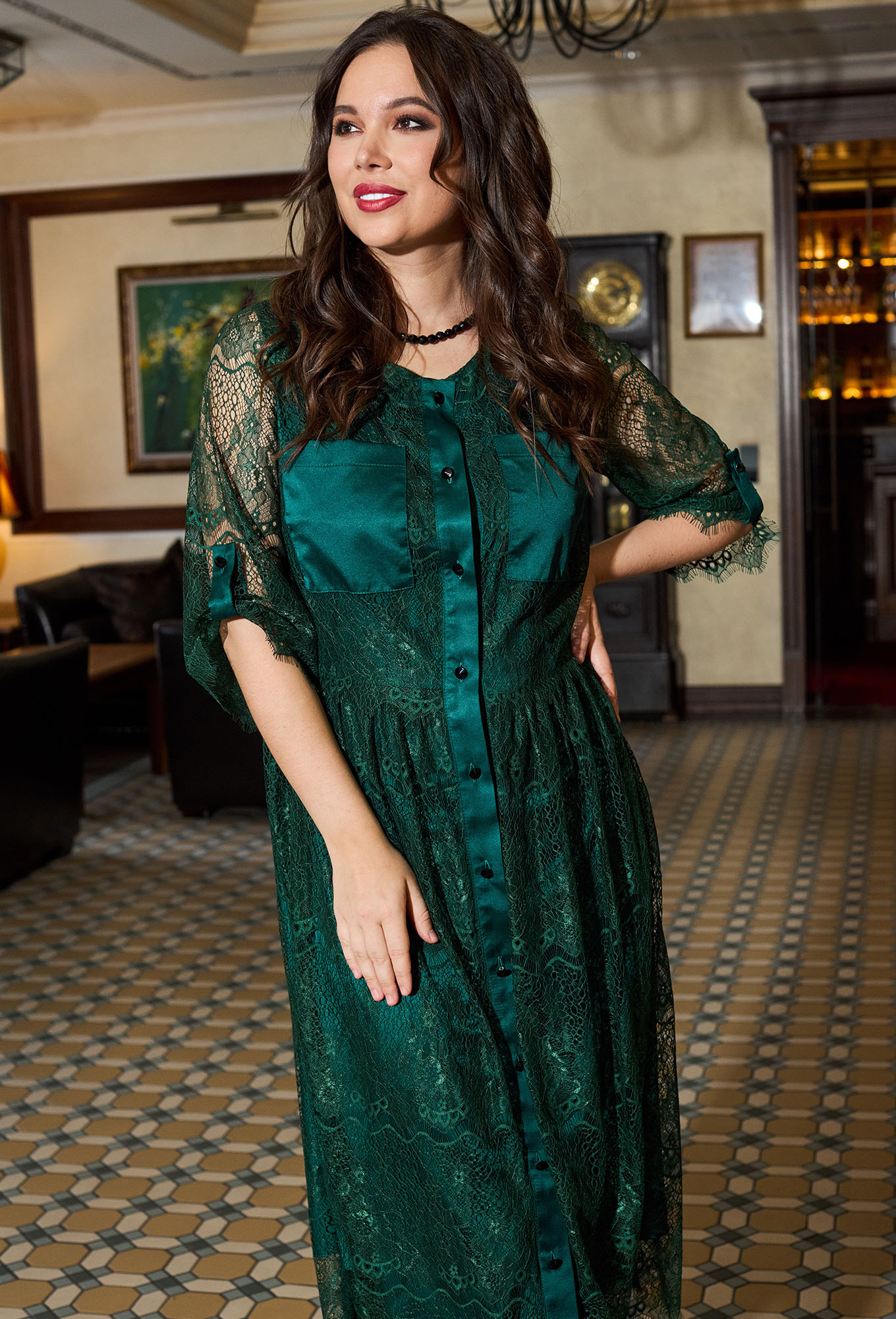 Платье выполнено из однотонного трикотажного полотна “гипюр” и однотонной ткани типа атлас. Платье длиной ниже колена. Верхняя часть платья выполнена из гипюра. Нижняя часть платья, планки полки и карманы выполнены из атласа. Нижняя часть лифа полочки с нагрудными вытачками, нижняя часть спинки лифа цельная. Верхняя часть лифа полочки с нагрудными вытачками, верхняя часть спинки лифа цельная. По центру платья обработана притачная планка с застежкой на петли и пуговицы. Горловина круглой формы. Рукав длиной 3\4, по низу с фистонами и патой, крепящейся пуговицей. К нижней части лифа притачана юбка двухслойная юбка, нижняя часть которой формы колокол выполнена из атласа, а верхняя часть со сборкой по шву притачивания и фистонами по низу. Нижний край верхней части лифа отлетной с фистонами.