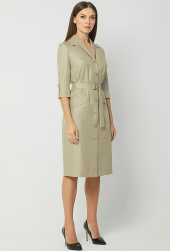 Платье прямого силуэта с центральной застежкой на пуговицы, фигурным воротником, косыми карманами с клапанами по переду рукава втачные с манжетами и патами с пуговицами дополняется поясом из основной ткани.