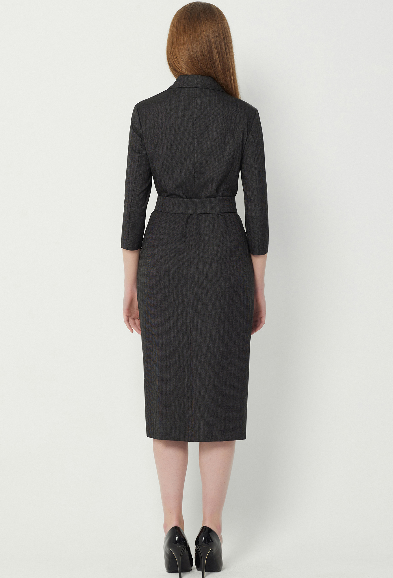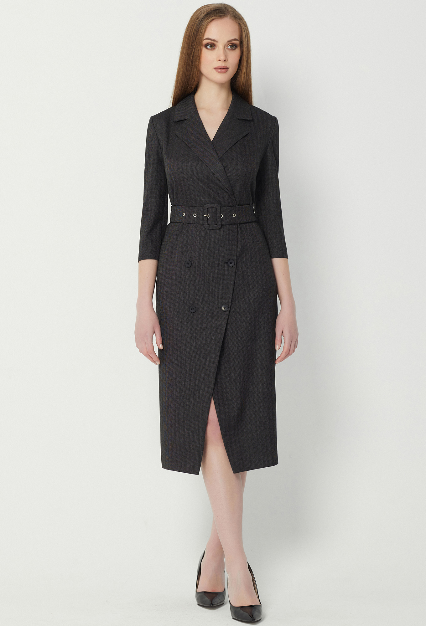 Элегантное платье-миди приталенного силуэта с двубортной застёжкой на петли-пуговицы, с отложным воротником с лацканами. Рукава втачные двухшовные, дополняется поясом с пряжкой из основной ткани.