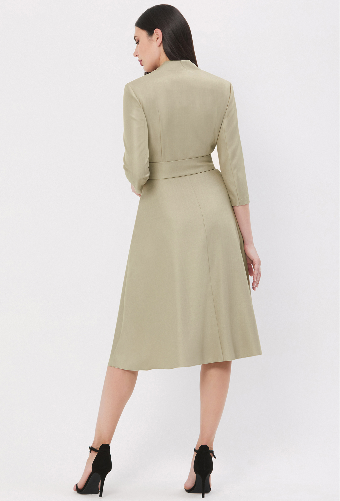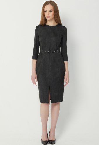 Платье-миди Х-образного силуэта, отрезное по линии талии. Верхняя часть переда с эффектом запаха и фигурной формой борта. Рукава втачные двушовные. Воротник – стойка. Дополняется поясом с пряжкой из основной ткани.