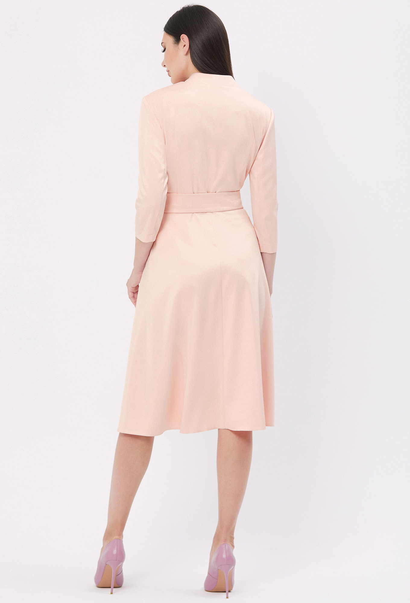 Платье-миди Х-образного силуэта, отрезное по линии талии. Верхняя часть переда с эффектом запаха и фигурной формой борта. Рукава втачные двушовные. Воротник – стойка. Дополняется поясом с пряжкой из основной ткани.