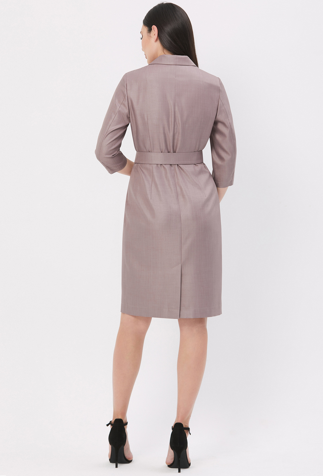 Данная модель платья получилась одновременно элегантной и комфортной. Первое возможно благодаря эффекту запаха, приталенному силуэту, отложному воротнику с лацканами, поддерживающими V-образный вырез. Второе – за счет удобной к телу ткани с добавлением вискозы. Линию талии подчеркивает пояс из основной ткани с металлической пряжкой-протяжкой.