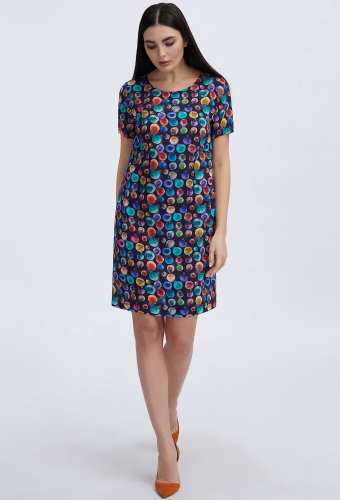 Платье прямого силуэта, выполнено из итальянской вискозы с ярким интересным принтом, с округлой формой горловины, втачными рукавами, в среднем шве спинки обработана застёжка на одну навесную петлю и пуговицу.
