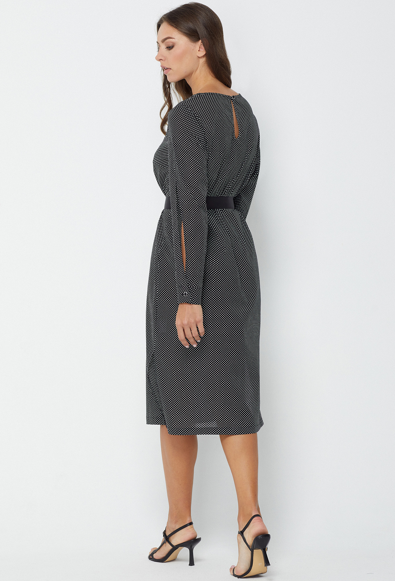 Данная модель миди-платье прямого силуэта – эталон женственного образа. Правильное настроение задали при помощи стильного принта и интересного кроя рукавов с разрезами, частично приоткрывающими руки, и манжетами с отделочными пуговицами. Динамичность модели придают разрезы в боковых швах. По спинке обработана застёжка-капля с навесной петлёй и отделочной пуговицей. Сформировать приталенный силуэт помогает пояс с D-пряжкой.