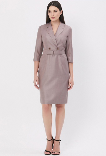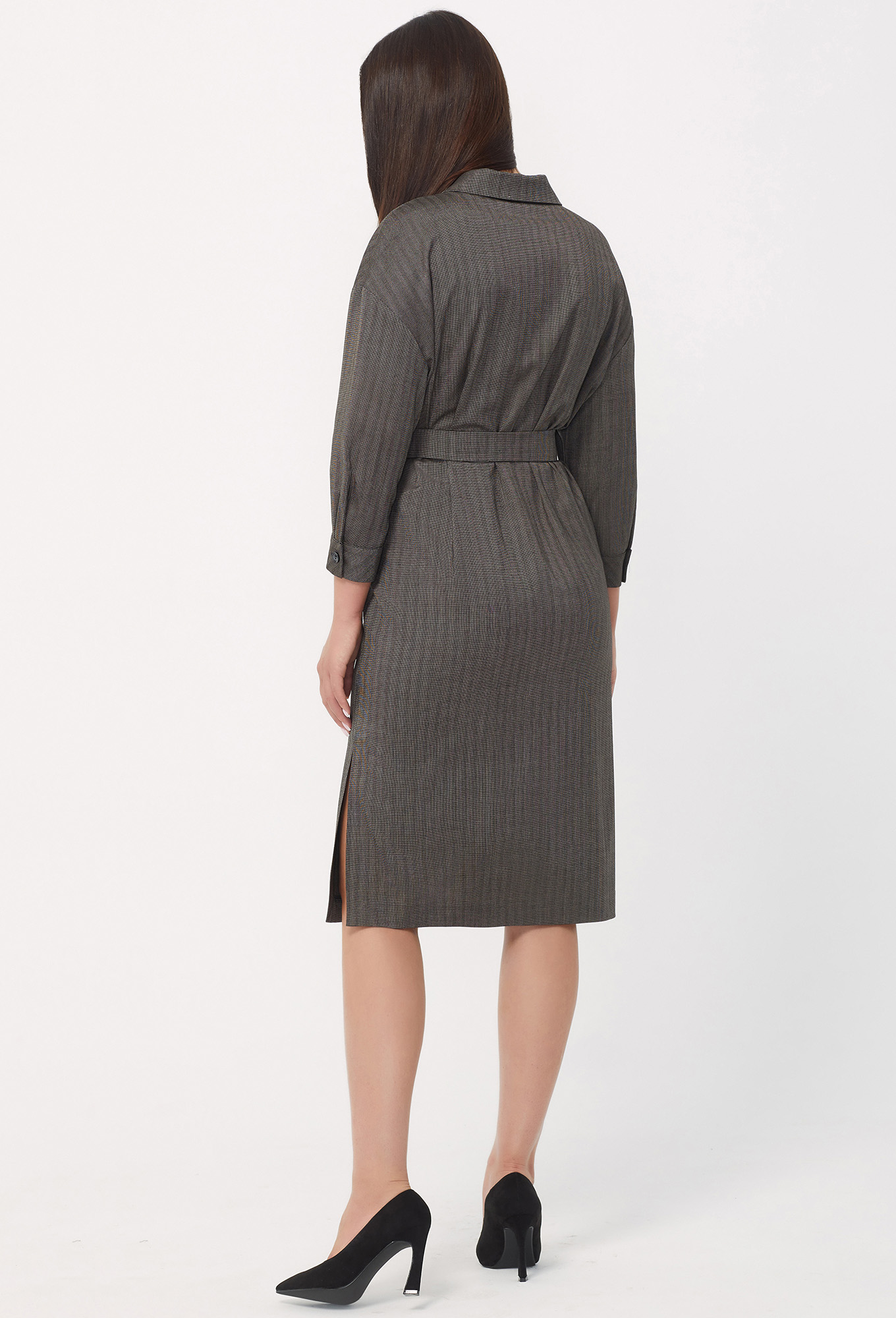 Платье-рубашка выполнено из мягкой ткани с добавлением вискозы. Перед платья с накладными карманами с клапанами и застёжкой на петли и пуговицы. Лёгкость платью придают укороченные рукава с притачными манжетами и разрезы в боковых швах. Воротник отложной с отрезной стойкой. Приталенный силуэт помогает создать пояс из основной ткани с пряжкой.