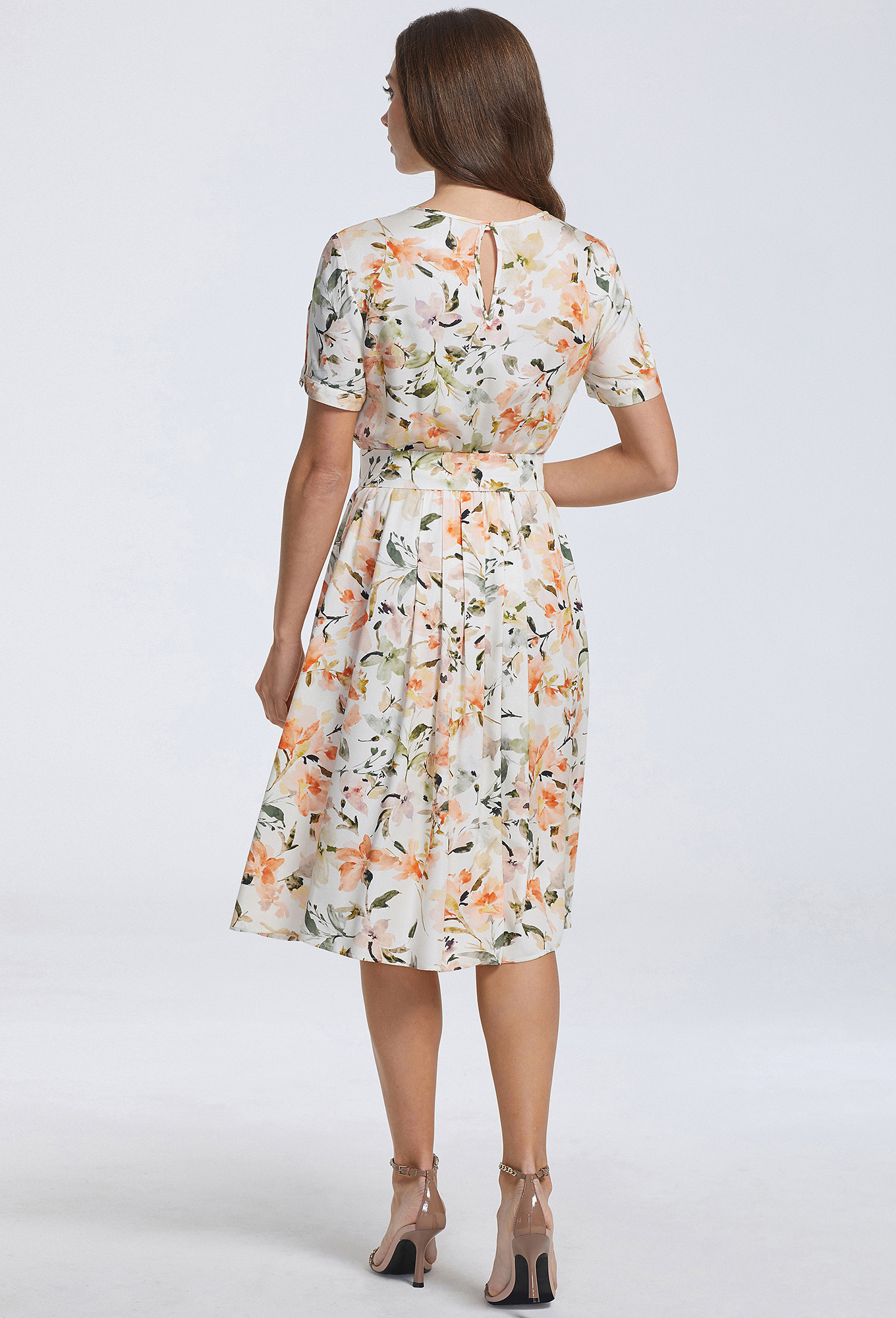 Чрезвычайно нежное платье Х-образного силуэта, частично отрезное по линии талии и собранное на эластичную тесьму, выполнено из мягкой, приятной итальянской вискозной ткани с акварельным цветочным принтом. Привлечь особое внимание к себе помогает интересный крой со складками и драпировками. Модель с округлой формой горловины и короткими рукавами со складками по низу и узкими манжетами с декоративными пуговицами. Для удобства в эксплуатации, по спинке обработана каплевидная застёжка на навесную петлю и потайную пуговицу. Завершает модель пояс с пряжкой из основной ткани.