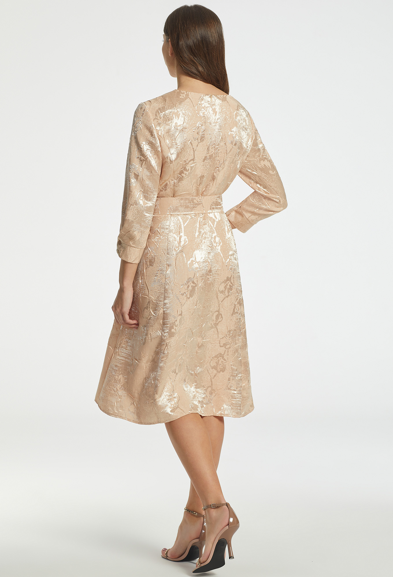 Элегантное платье Х-образного силуэта выполнено из красивой ткани. Романтичность платью придают интересного кроя укороченные рукава со складками и притачными манжетами с декоративными пуговицами. В среднем шве спинки обработана потайная молния, а в боковых швах функциональные карманы. Чтобы сделать модель еще более эффектной, линию талии подчеркнули широким поясом с пряжкой из основной ткани.