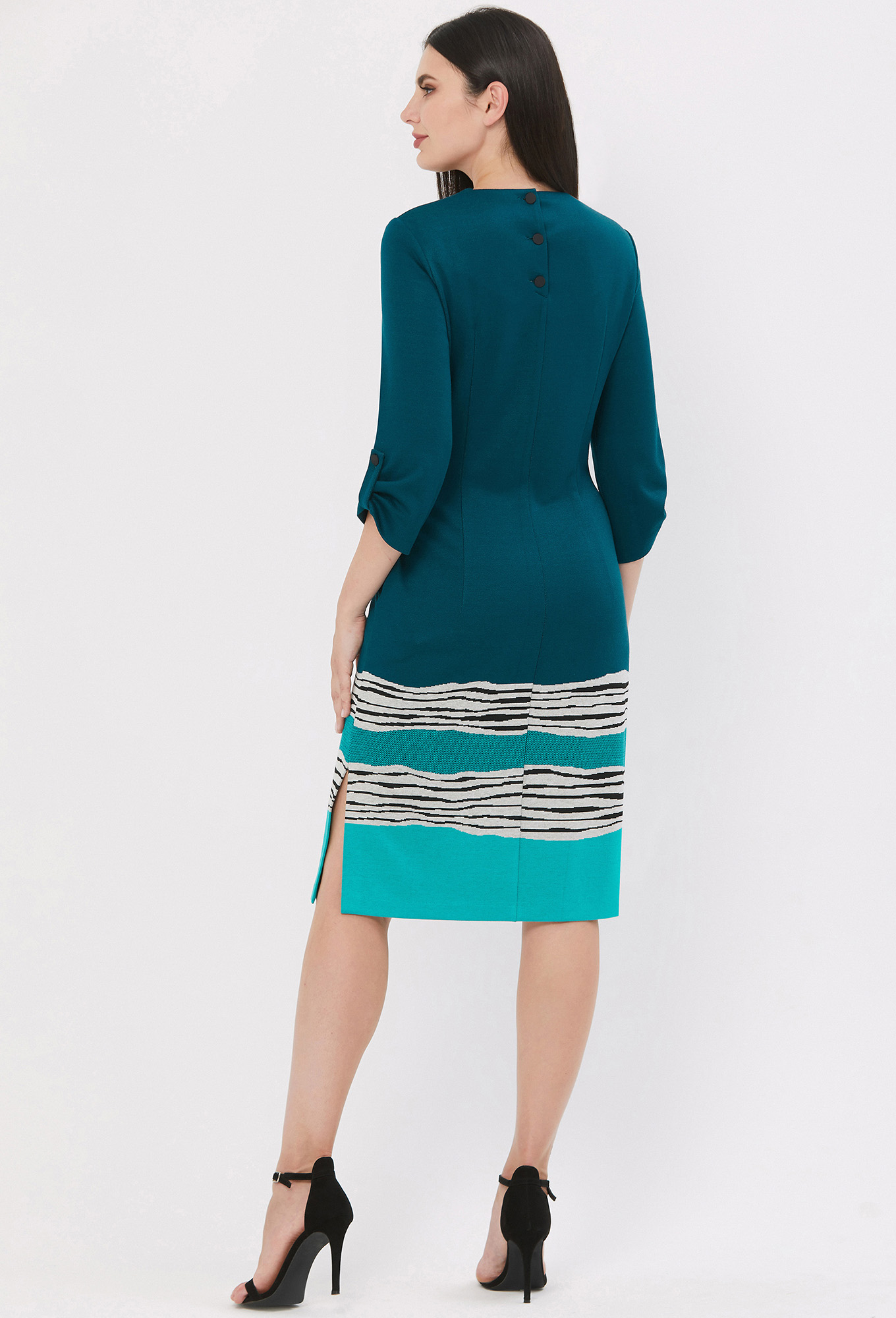 В этом платье лаконичной формы Вы обязательно окажетесь в центре внимания, благодаря стильному принту с красивым сочетанием цвета, полоски и интересному решению кроя рукава. Для создания модели с округлым вырезом горловины использовали итальянский трикотаж с добавлением вискозы. В среднем шве спинки обработана застёжка на три отделочные пуговицы и петли. Рукава втачные укороченные с декоративными патами с пуговицами. В боковых швах обработаны разрезы и функциональные карманы.