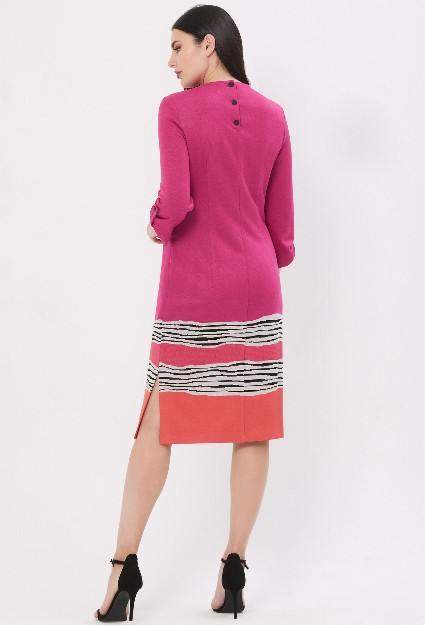 В этом платье лаконичной формы Вы обязательно окажетесь в центре внимания, благодаря стильному принту с красивым сочетанием цвета, полоски и интересному решению кроя рукава. Для создания модели с округлым вырезом горловины использовали итальянский трикотаж с добавлением вискозы. В среднем шве спинки обработана застёжка на три отделочные пуговицы и петли. Рукава втачные укороченные с декоративными патами с пуговицами. В боковых швах обработаны разрезы и функциональные карманы.