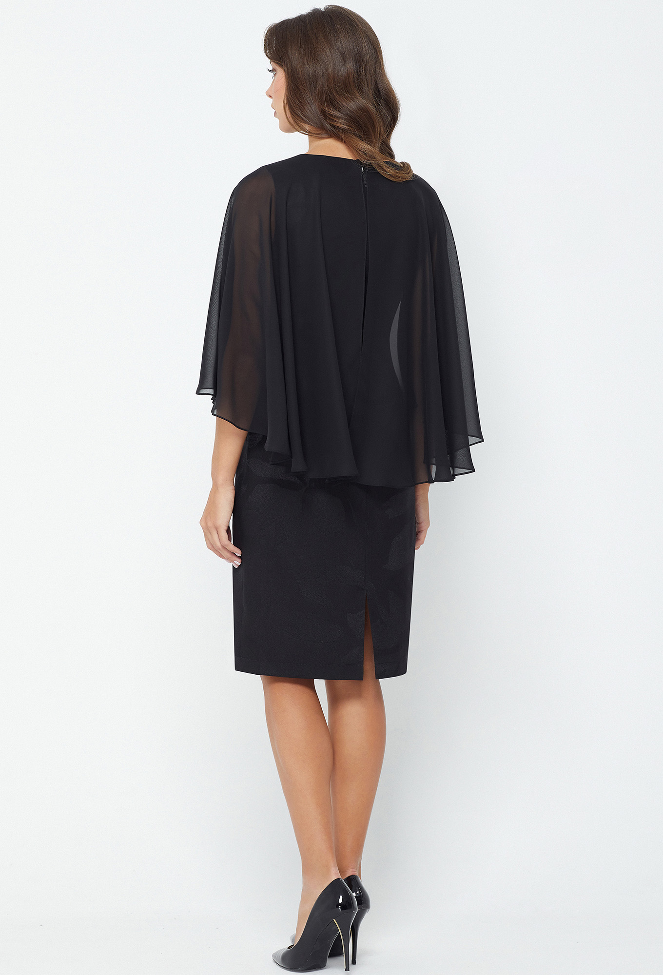 Элегантное платье приталенного силуэта без рукавов дополнено красивой пелериной из тонкого струящегося шифона, частично соединяющейся с передом платья, а по спинке имитирующий шаль. Привлечь к себе внимание также помогает и ткань с интересным сочетанием матовой основы с цветочным атласным дизайном. Перед отрезной по линии талии, в среднем шве спинки обработаны застёжка на потайную молнию и разрез. Праздничное настроение с таким платье Вам точно гарантировано.