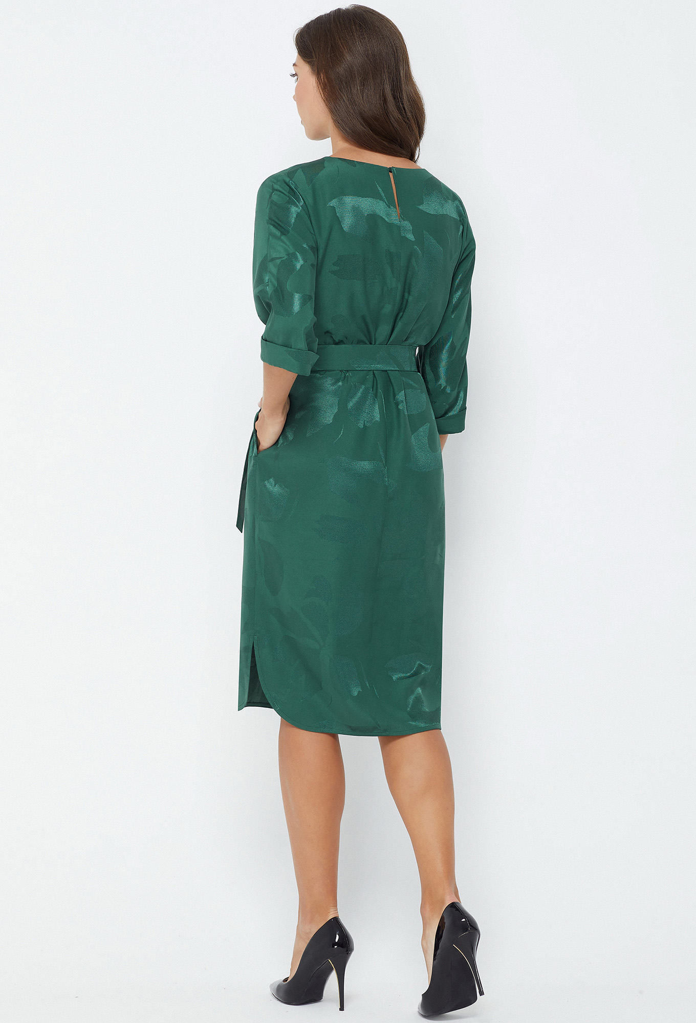Несмотря на лаконичный крой платья, в нём вы обязательно окажетесь в центре внимания, благодаря красивой ткани с интересным сочетанием матовой основы и цветочного атласного дизайна, а также некоторым элементам кроя. Модель свободного кроя с цельнокроенными рукавами, с приталенными отложными манжетами и фигурной формой низа. В среднем шве спинки обработана застёжка на навесную петлю и пуговицу, в боковых швах обработаны функциональные карманы. Линия талии красиво подчёркивается интересным поясом с пуговицами из основной ткани.