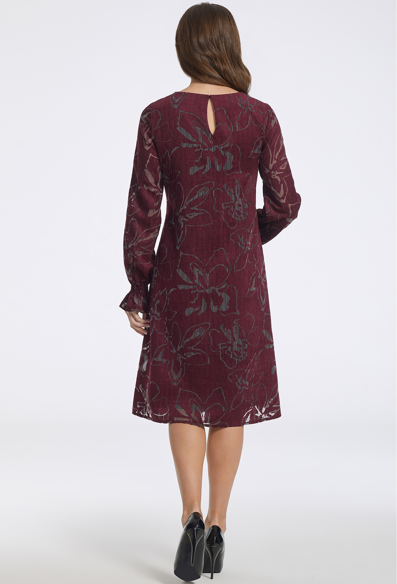 Платье-миди А-образного силуэта. Нижний слой платья выполнен из приятной к телу ткани. Несмотря на лаконичный крой, платье не лишено интересных деталей, таких как V-образный вырез нижнего слоя, облегчающий зону декольте и объёмные прозрачные рукава со сборкой не венгерку в несколько рядов по низу. Для удобства в эксплуатации, по спинке обработана застёжка-капля на навесную петлю и потайную пуговицу.