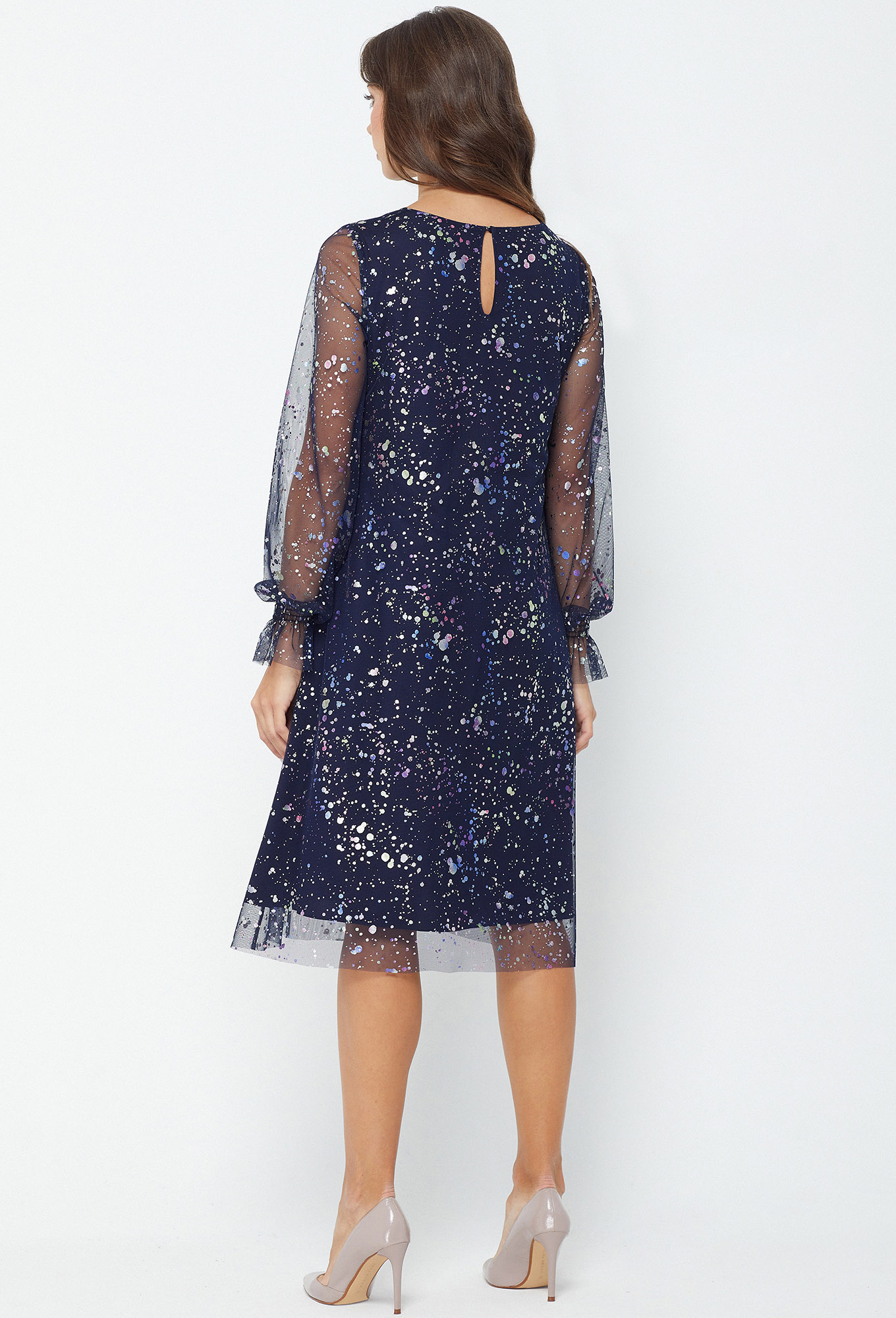 Это платье-миди А-образного силуэта – беспроигрышное решение для создания эффектного коктейльного образа. Модель сшита из мягкой мелкой сетки с интересным дизайном «калейдоскоп» с плавными переходящими цветовыми акцентами и металлическим эффектом с деликатным блеском. Нижний слой платья выполнен из мягкой приятной к телу 100% вискозной ткани. Несмотря на лаконичный крой, платье не лишено интересных деталей, таких как V-образный вырез нижнего слоя, облегчающий зону декольте и объёмные прозрачные рукава со сборкой не венгерку в несколько рядов по низу. Для удобства в эксплуатации, по спинке обработана застёжка-капля на навесную петлю и потайную пуговицу.