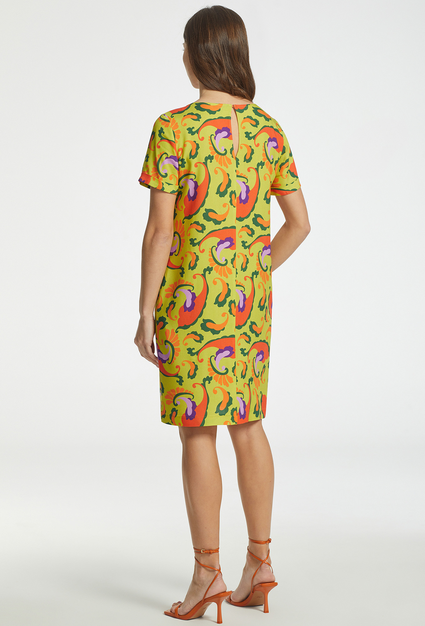 Лаконичное платье из легкой, приятной к телу 100% вискозной ткани со стильным ярким принтом. Модель прямого силуэта, с округлой формой горловины и короткими рукавами с отложными манжетами. Для удобства в эксплуатации, в среднем шве спинки обработана застежка на навесную петлю и пуговицу, а в боковых швах – функциональные карманы.