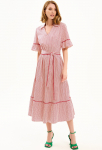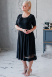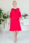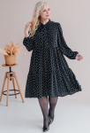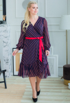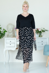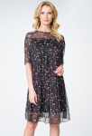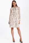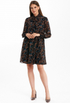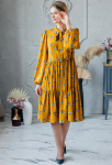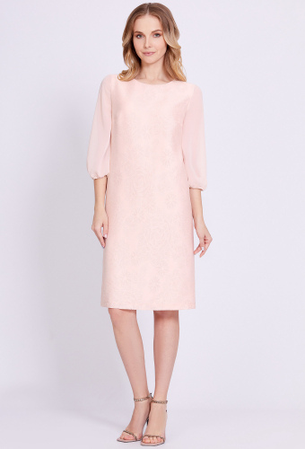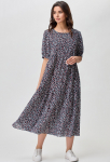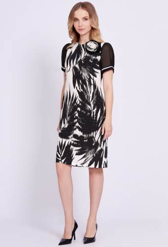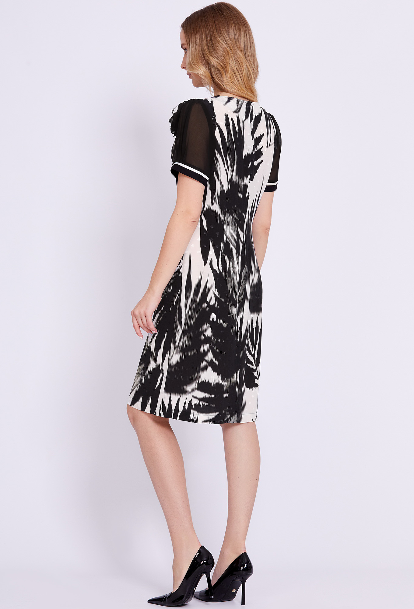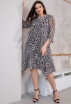 Это элегантное платье полуприлегающего силуэта – идеальное решение для обладательниц тонкого вкуса. Изделие с округлой формой горловины сшили из комфортной вискозной ткани с красивым принтом с интересным сочетанием матовой основы и атласного горошка, и дополнили шифоновыми рукавами со складками с узкими манжетами. Для удобства в эксплуатации в среднем шве спинки обработана застёжка на потайную молнию.