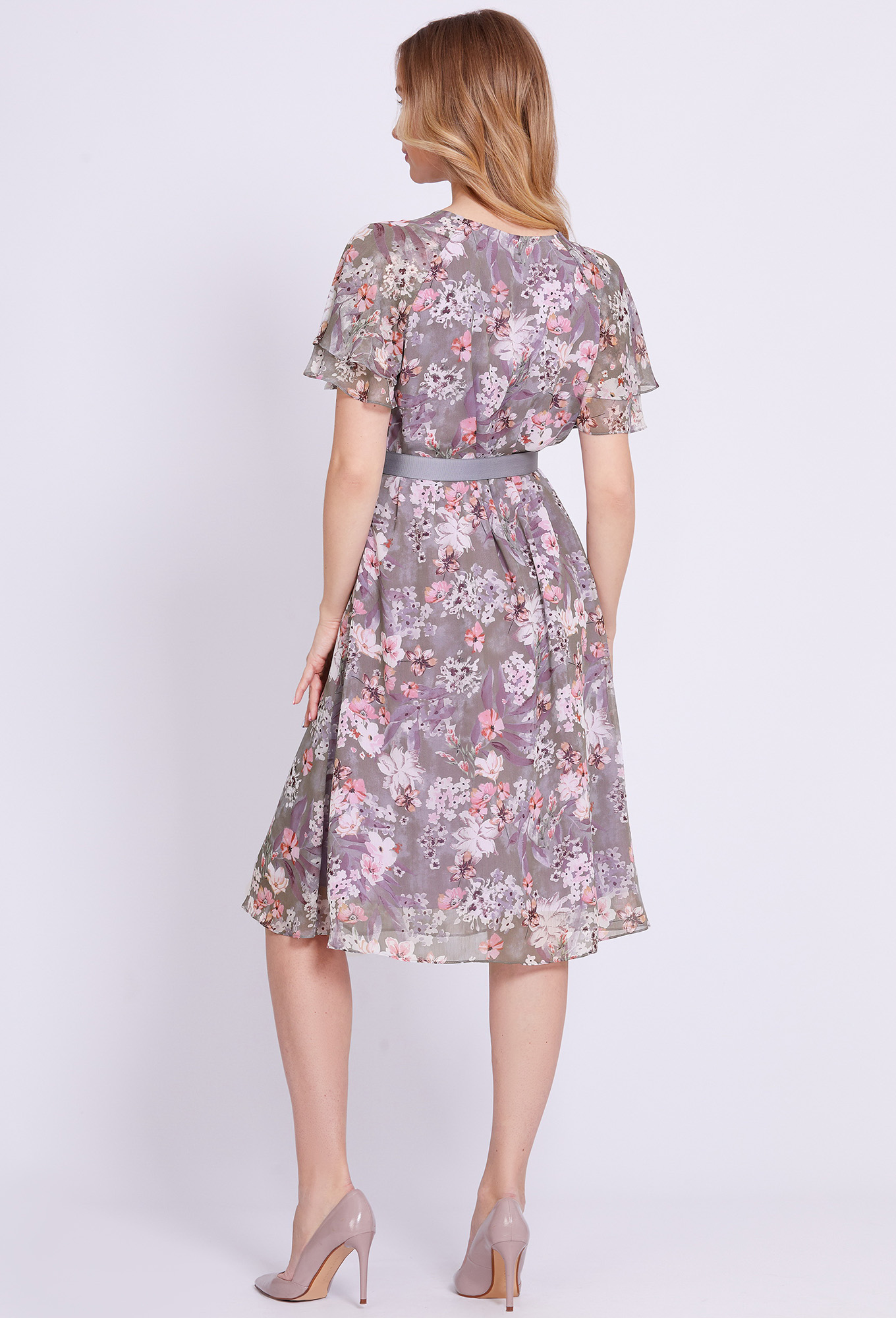 Воздушное платье расклешённого кроя с округлой формой горловины выполнили из фактурного шифона с нежным цветочным принтом. Максимально женственной модель делают струящийся силуэт, сборка по горловине переда и двойные рукава-бабочки. Нижний слой платья выполнен из мягкой приятной к телу 100% вискозной ткани. Чтобы сделать платье еще более эффектным, линию талии подчеркнули стильным поясом с пряжкой.