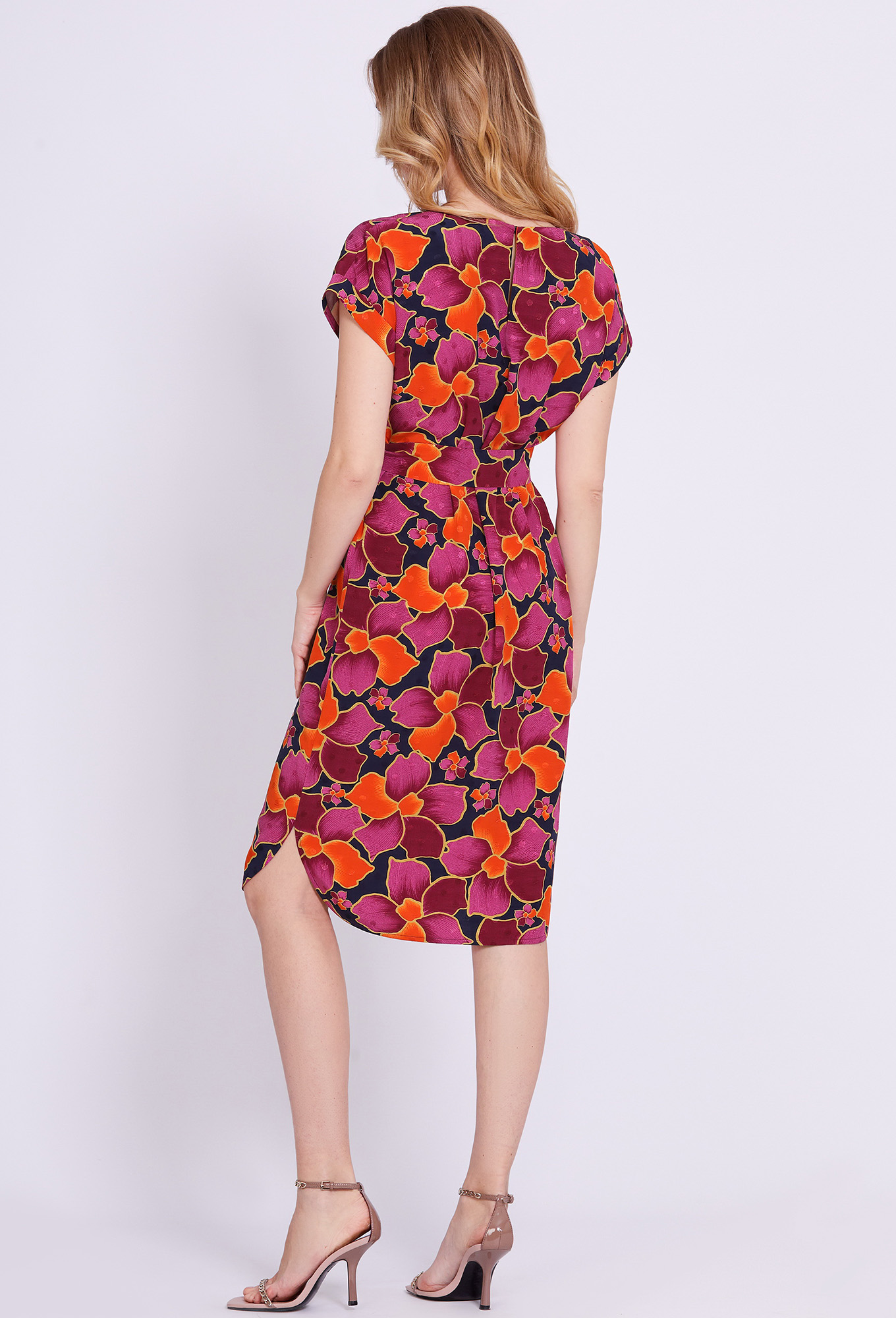 Несмотря на лаконичный крой платья, в нём вы обязательно окажетесь в центре внимания, благодаря красивой испанской ткани с интересным сочетанием матовой основы с ярким цветочным принтом и мелкого атласного горошка. Модель свободного силуэта с цельнокроеными рукавами с отложными манжетами, с округлой формой горловины, фигурным низом и застёжкой на одну навесную петлю и пуговицу по спинке. Платье дополнено съёмным поясом-завязкой в тон, красиво подчёркивающим женскую талию.