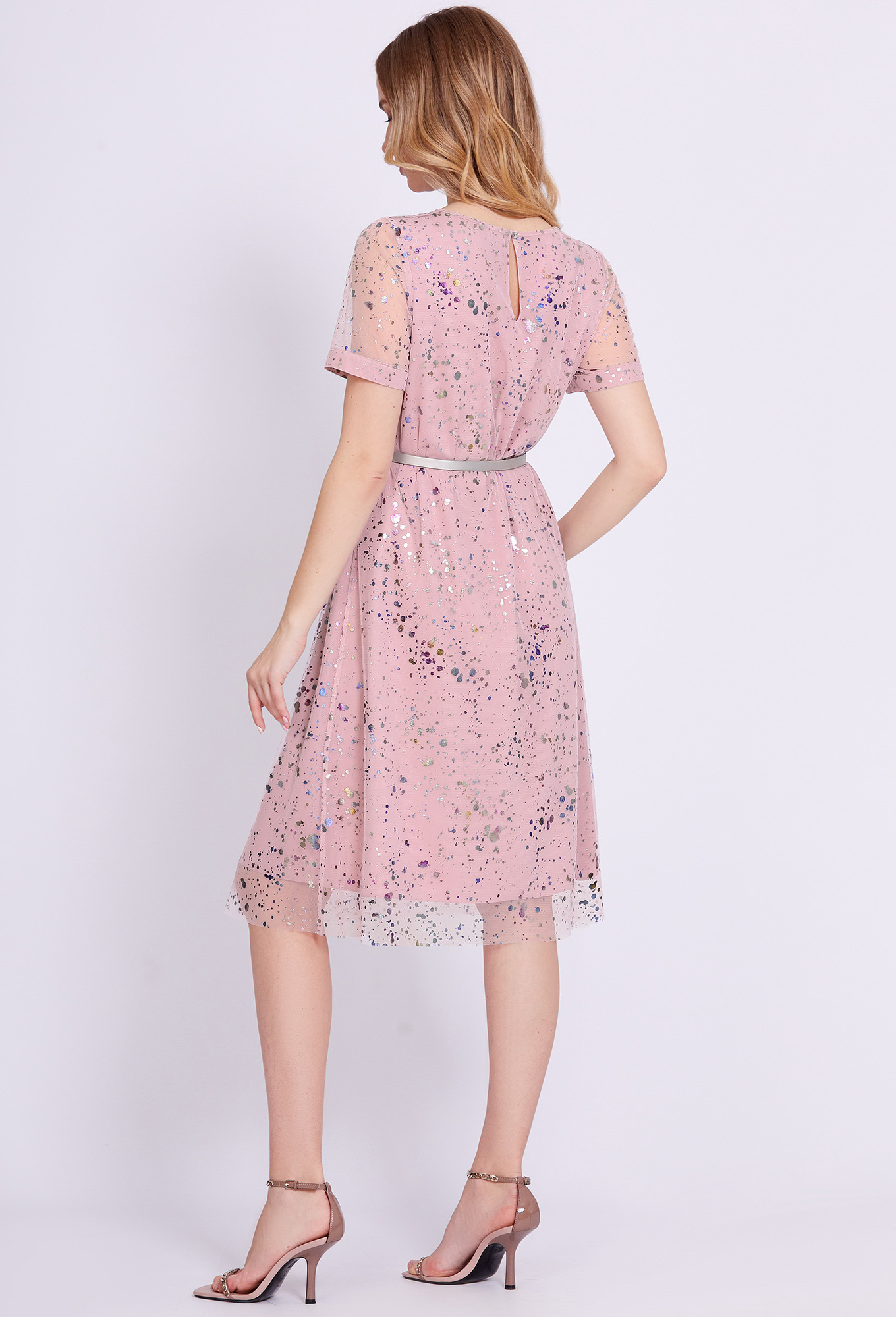 Это платье-миди А-образного силуэта – беспроигрышное решение для создания эффектного коктейльного образа. Модель сшита из мягкой мелкой сетки с интересным дизайном «калейдоскоп» с плавными переходящими цветовыми акцентами и металлическим эффектом с деликатным блеском. Нижний слой платья выполнен из мягкой приятной к телу 100% вискозной ткани. Несмотря на лаконичный крой, платье не лишено интересных деталей, таких как V-образный вырез нижнего слоя, облегчающий зону декольте и короткие прозрачные рукава с притачными манжетами. Для удобства в эксплуатации, по спинке обработана застёжка-капля на навесную петлю и декоративную пуговицу. Линия талии красиво подчёркивается поясом-ремнём с пряжкой.