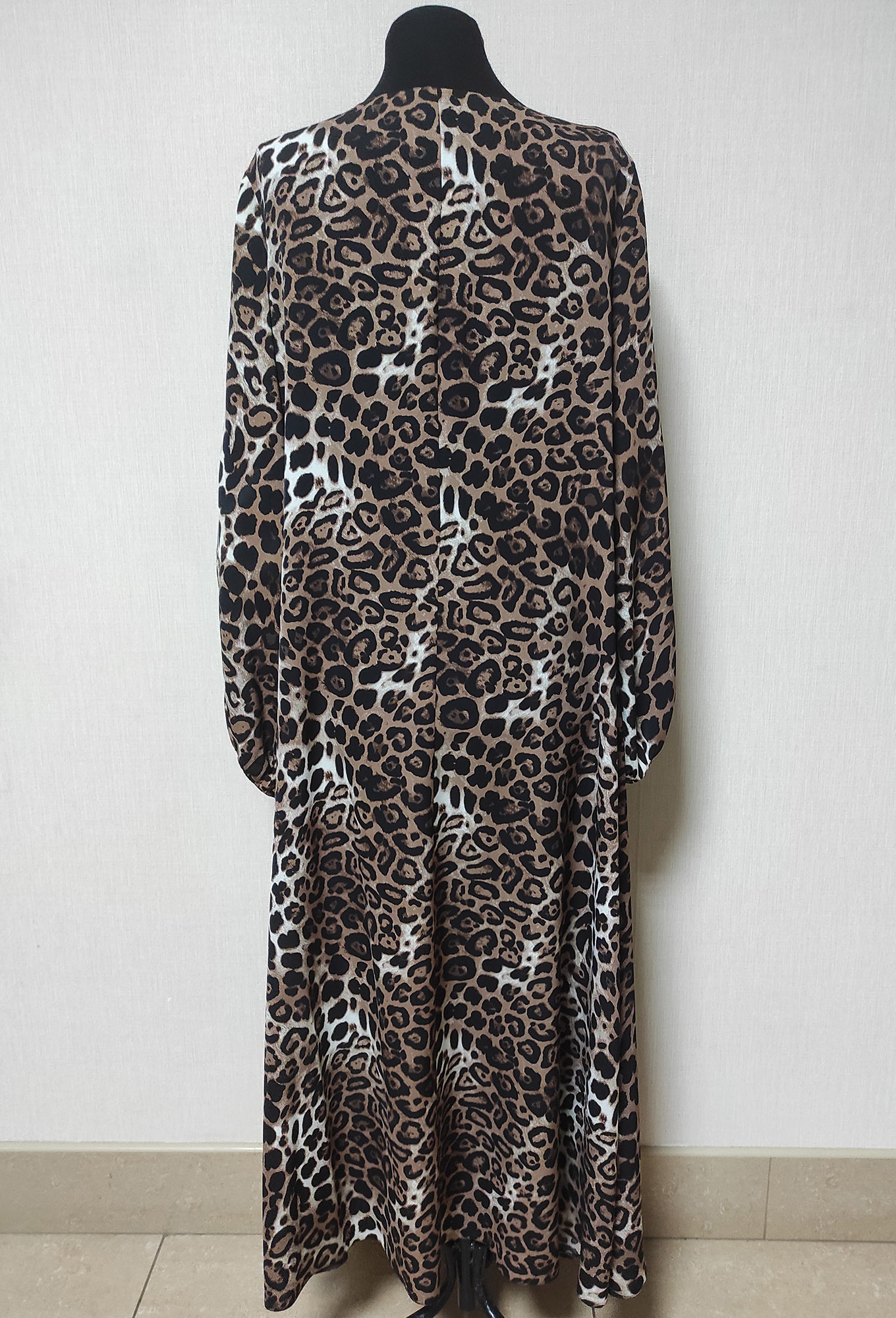 Платье женское полуприлегающего силуэта расширенное к низу, выполнено из плательной ткани с анималистичным принтом, рукав втачной по низу собран на резинку.