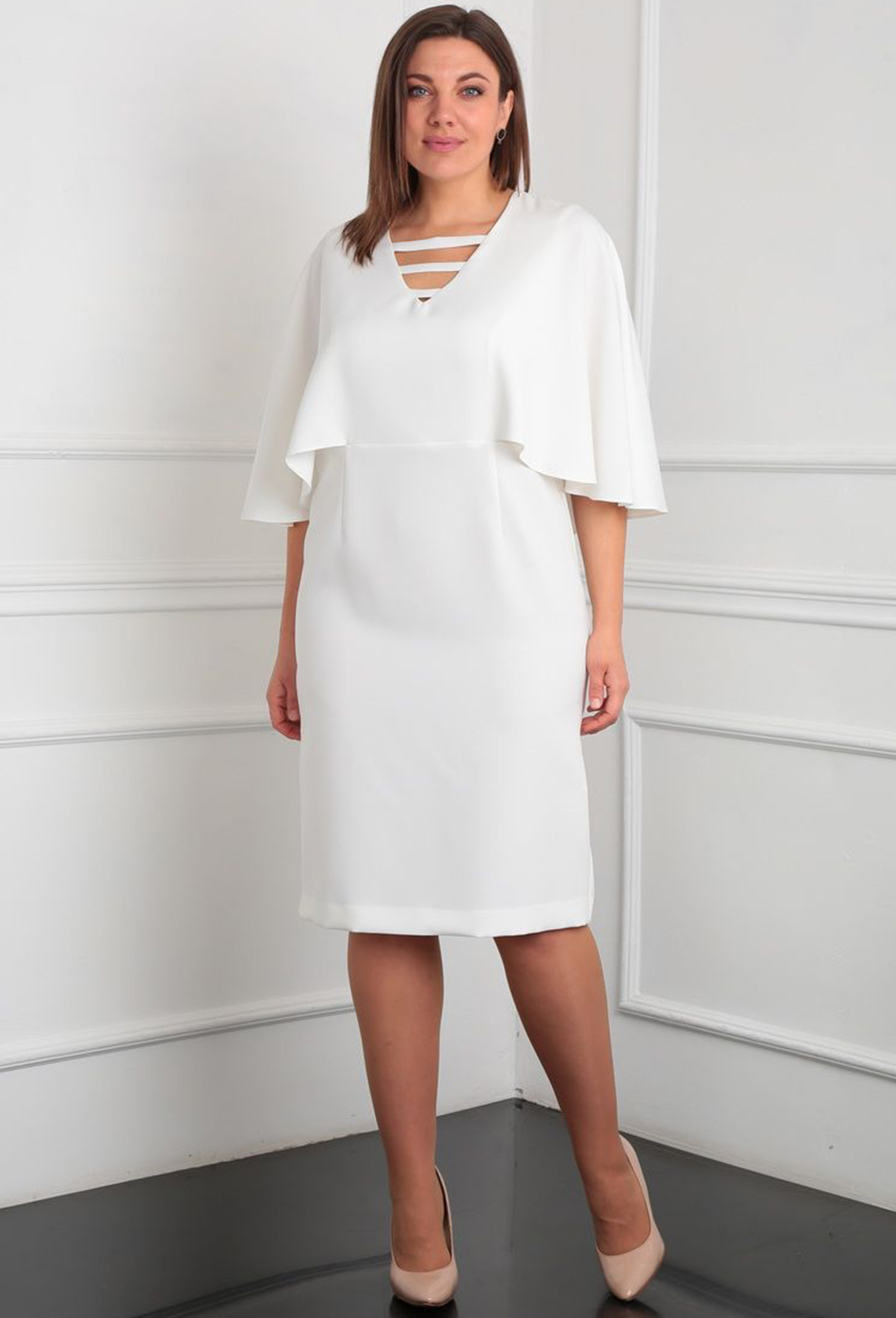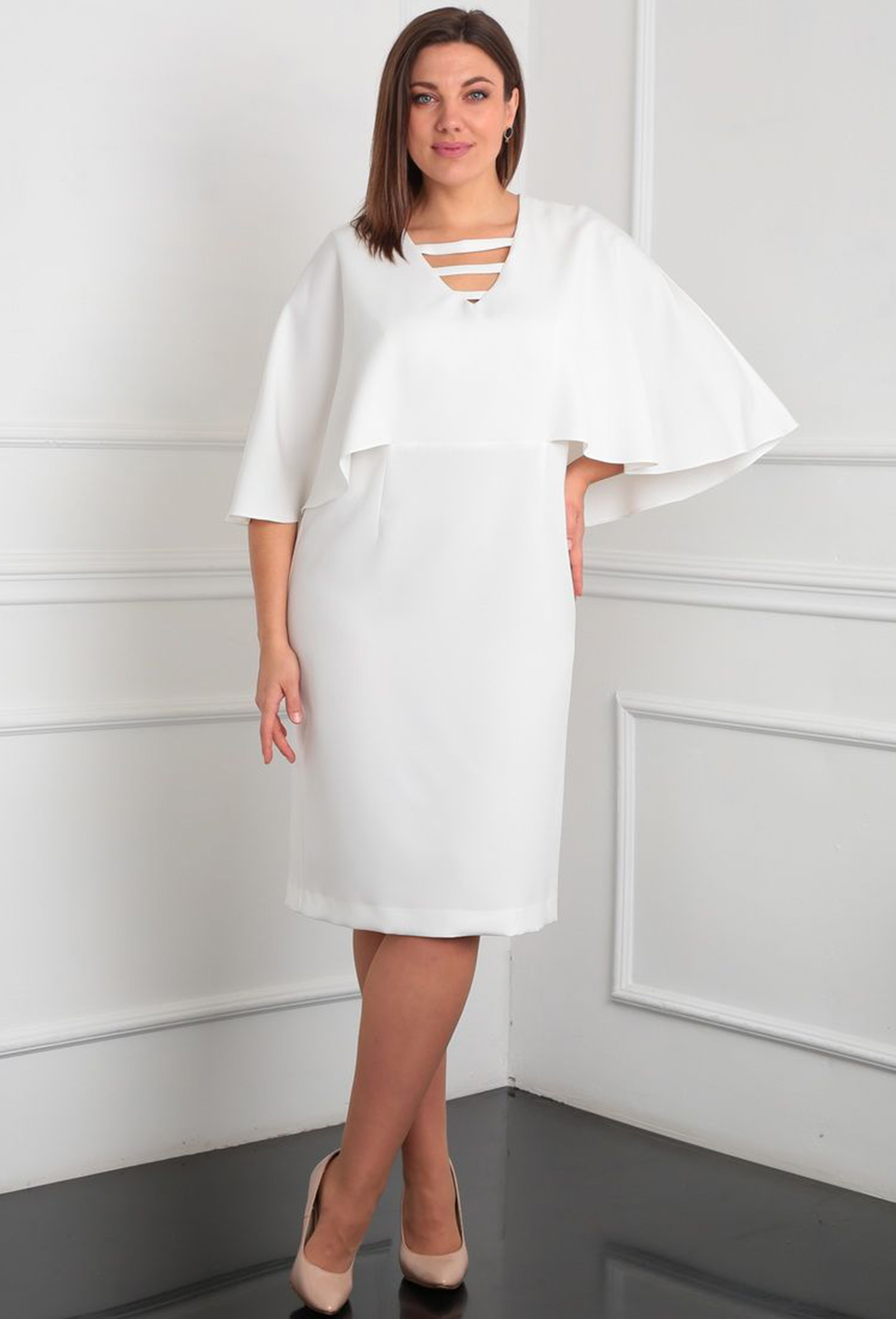 Элегантное и нарядное платье с цельнокроенной накидкой. Платье полуприлегающего силуэта. По линии талии отрезное. По переду юбки застрочены две вытачки. Под накидкой рельефы. Спинка состоит из нижней части юбки с талиевыми вытачками и верхней части. Накидка по спинке полностью отлетная. Вырез горловины V-ОБРАЗНЫЙ. По вырезу горловины притачаны три поперечные планки. По спинке по горловине застёжка на петлю навесную и пуговицу. По линии талии застёжка на потайную тесьму-молнию в левом боковом шве. Накидка хорошо скрывает несовершенства фигуры, если таковые есть, при этом не сковывает движения рук, а придаёт лёгкость и элегантность. По спинке по низу открытая отлетная шлица (разрез).