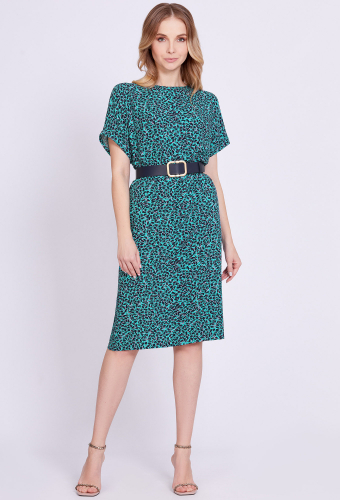 Платье полуприлегающего силуэта. Вырез горловины V - образный. Рукав короткий, по линии талии платье отрезное. Юбка полусолнце-клёш. По талии съёмный пояс, который регулируется с помощью пряжки и люверсов. По спинке втачана потайная тесьма-молния. Ткань приятная к телу.