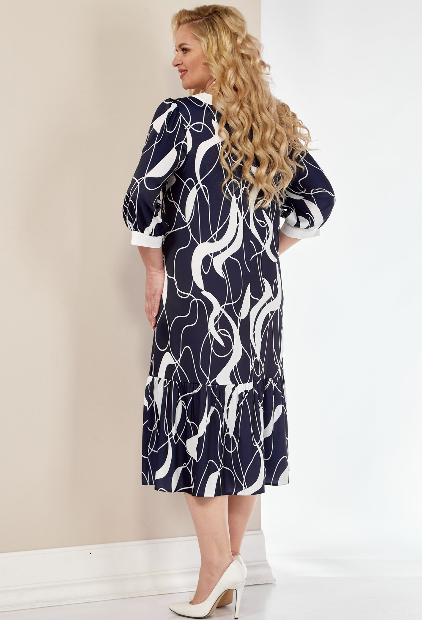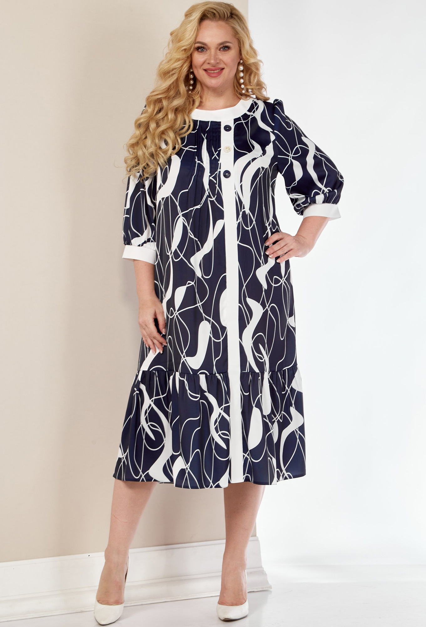 Женское платье выполнено из плательной ткани с вискозой в составе. Горловина округлая, вставка из планки молочного цвета. По переду защипы и пришиты на планку декоративные пуговицы. Платье с плечевыми накладками. Без подкладки. По низу платья валан. Платье свободного кроя. Рукав три четверти.
