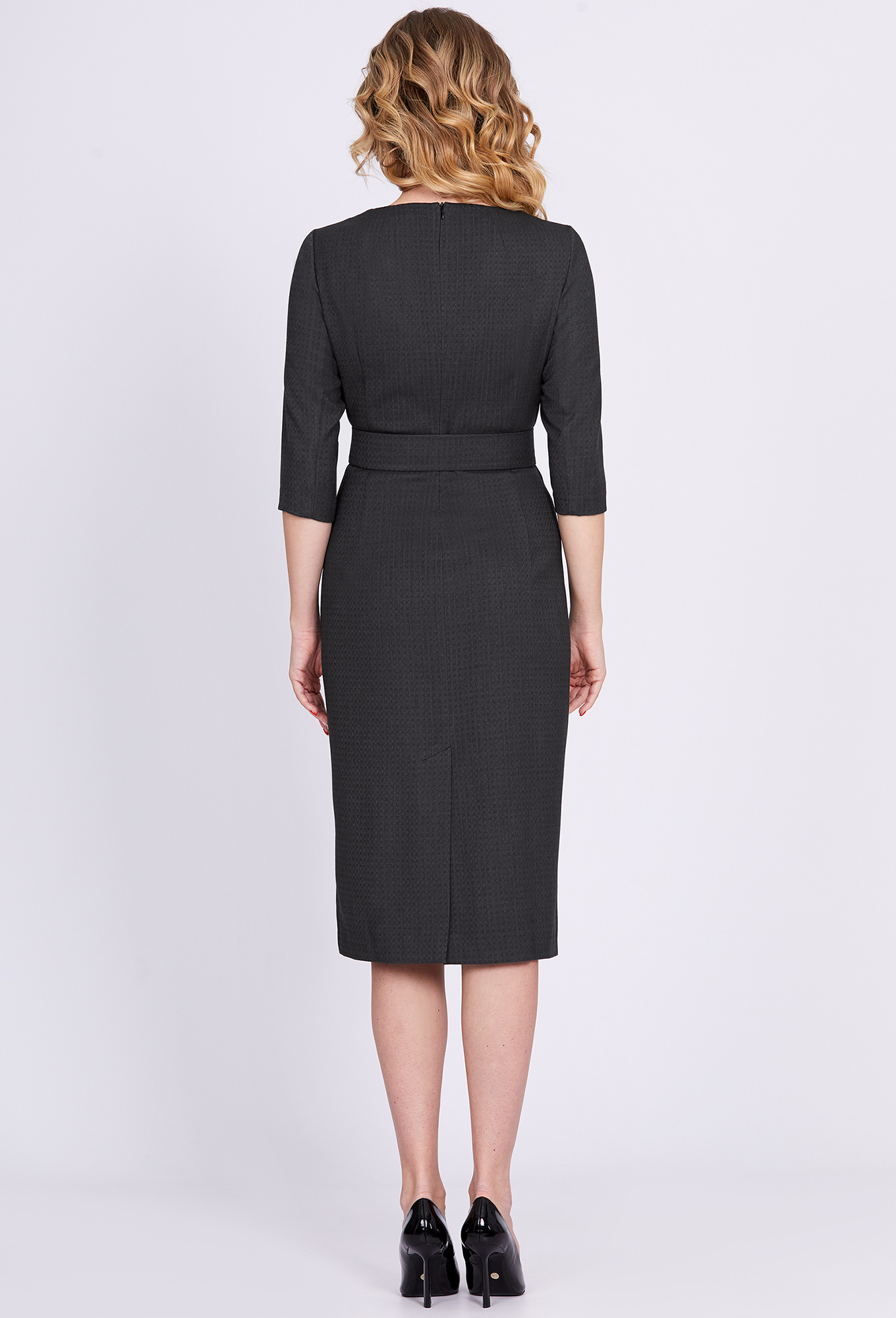 Платье-миди приталенного силуэта с овальным вырезом горловины. Перед с полурельефами и вытачками, спинка со средним швом и вытачками . В среднем шве спинки обработаны потайная молния и шлица. Рукава втачные. Платье дополняются поясом с пряжкой из основной ткани и брошью.