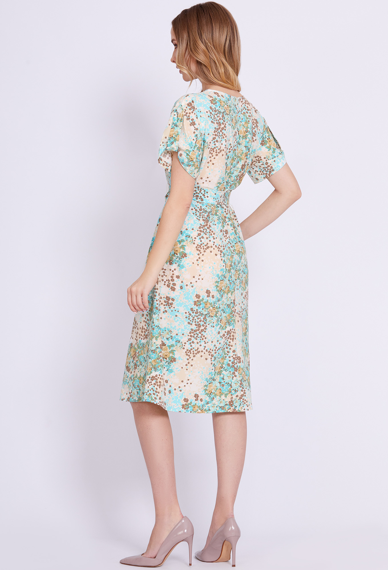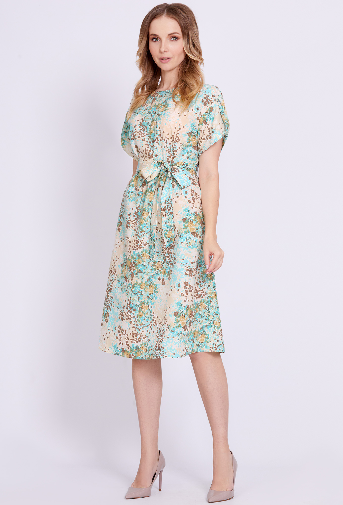 Минималистичное платье А-образного силуэта с округлой формой горловины, со спущенной линией проймы и длины ниже колен, выполнено из мягкой, приятной к телу ткани и интересным женственным принтом. Особое внимание в этой модели привлекают рукава с отделочными патами и пуговицами. В боковых швах обработаны функциональные карманы, а в среднем шве спинки – застёжка на навесную петлю и пуговицу. Модель дополнена поясом-подчёркивающим талию.