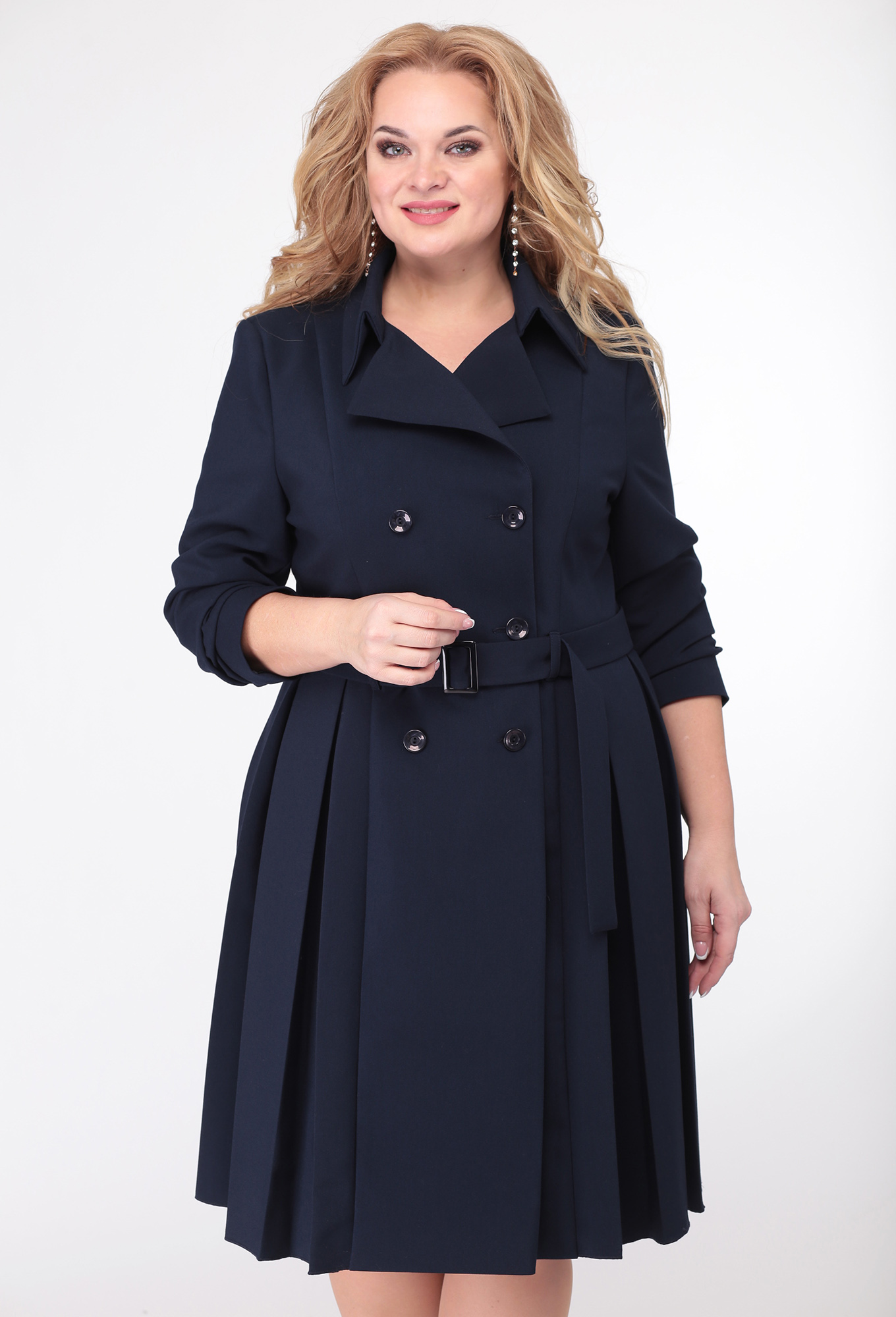 Платье-жакет полуприлегающего силуэта, выполнено из однотонной ткани. Платье-жакет на подкладке. Полочка жакета с центральной двубортной застежкой на шесть пуговиц. Воротник пиджачного типа на стойке, лацканы отложные. Жакет с вертикальными рельефами по полочке и по спинке, и отрезной по линии талии. Боковая часть в нижней части жакета со складками. Рукав втачной, двухшовный, длинный. По линии талии настрочены шлевки, через которые продет пояс с пряжкой.