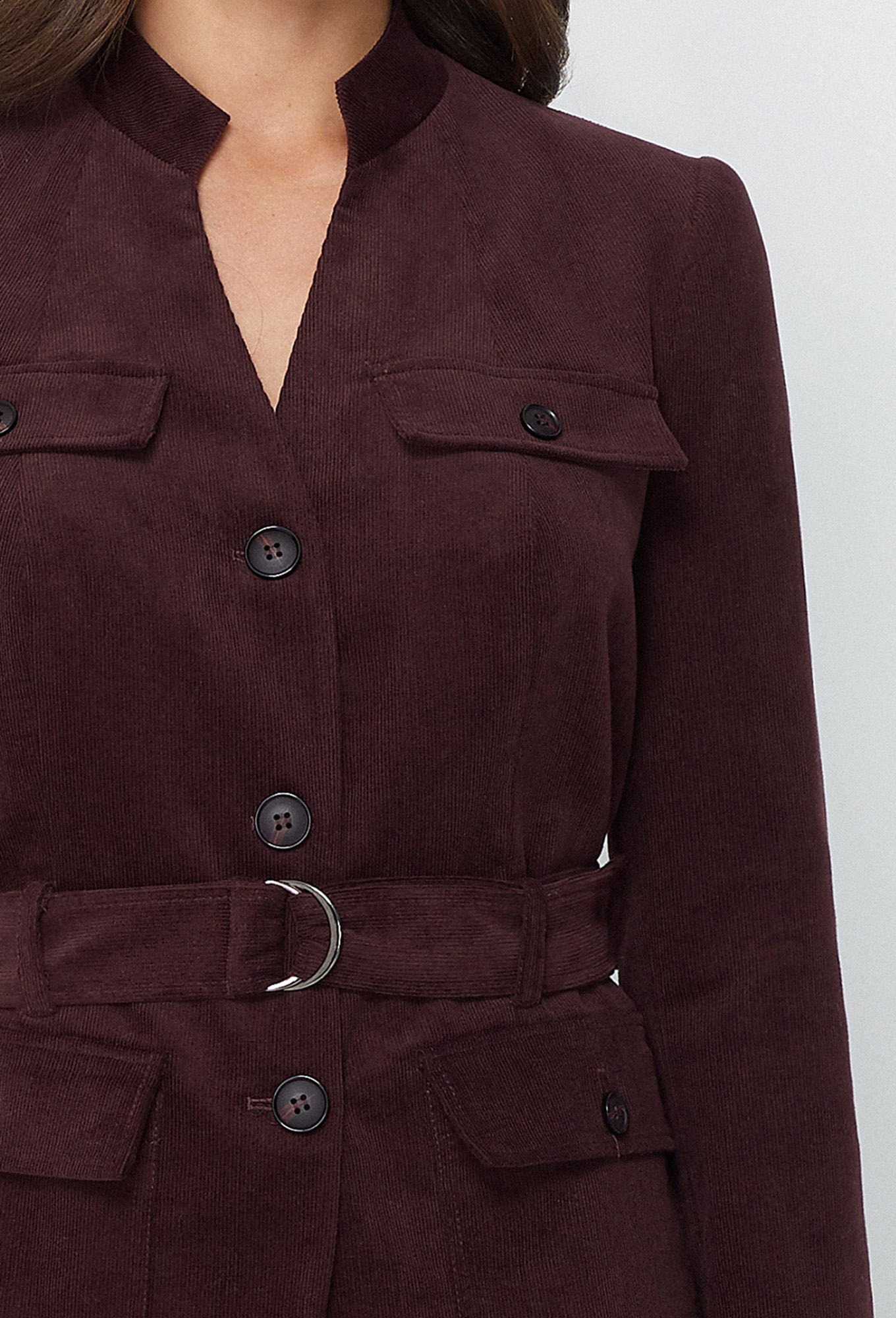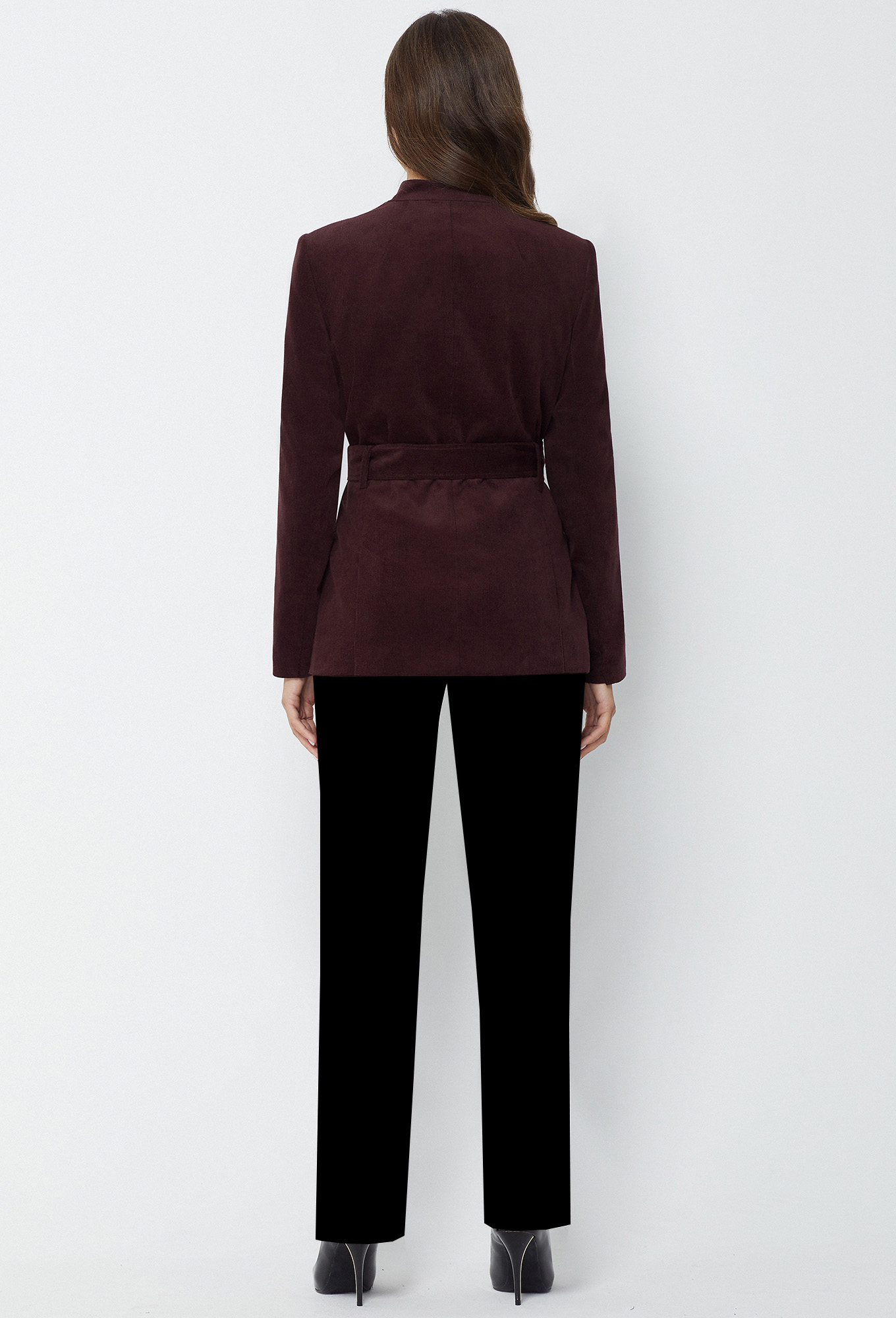 Однобортный жакет полуприлегающего силуэта из вельвета со стойкой, с застёжкой на 3 прорезные петли и три декоративные пуговицы, и шлевками для съемного пояса из основной ткани. Спереди два нагрудных клапана с декоративными пуговицами и два накладных кармана с клапанами и пуговицами. Спинка со средним швом и рельефами, заканчивающиеся шлицами. Двухшовный рукава со шлицей и пуговицами. На подкладке.