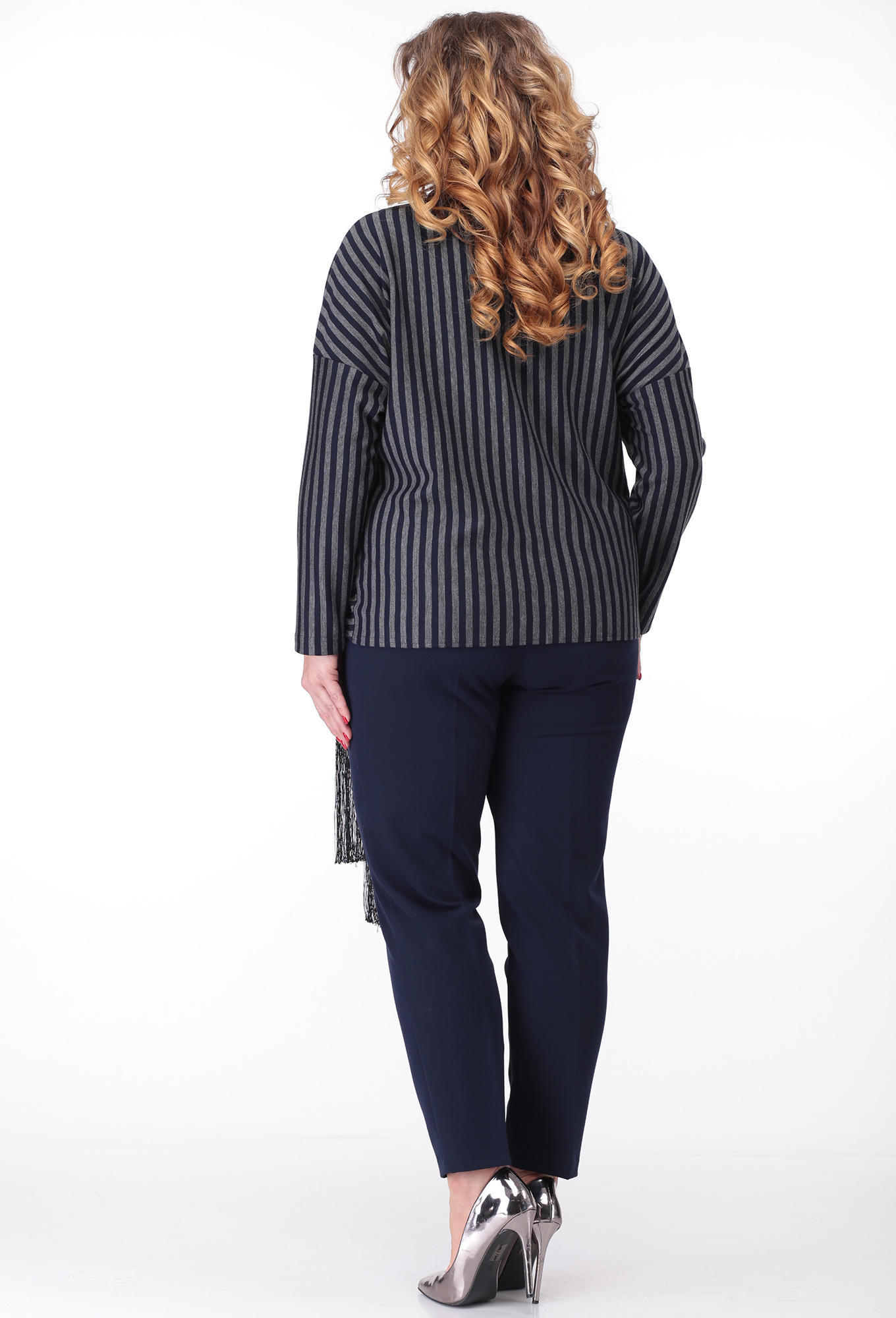 Костюм состоит из блузона и брюк. Блузон выполнен из трикотажного полотна в полоску. Брюки выполнены из однотонной костюмной ткани.