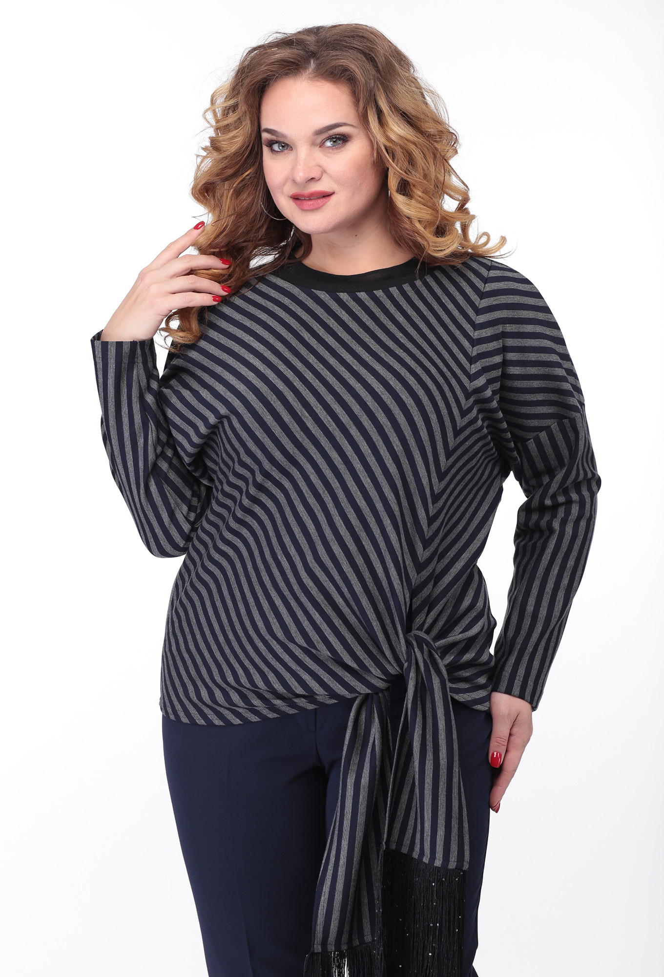 Блузон прямого свободного силуэта в верхней части. В области бедер (низ блузона) прилегание более плотное за счет конструктивного элемента в виде завязок с петлями на полочке. Низ правой части полки и левой части полки со стороны рельефа переходит в завязки. Горловина круглой формы. Спинка цельная, рукав одношовный, длинный.