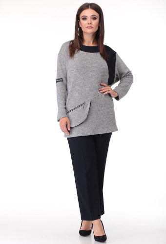 Костюм состоит из блузона и брюк. Блузон выполнен из трикотажного полотна в полоску. Брюки выполнены из однотонной костюмной ткани.