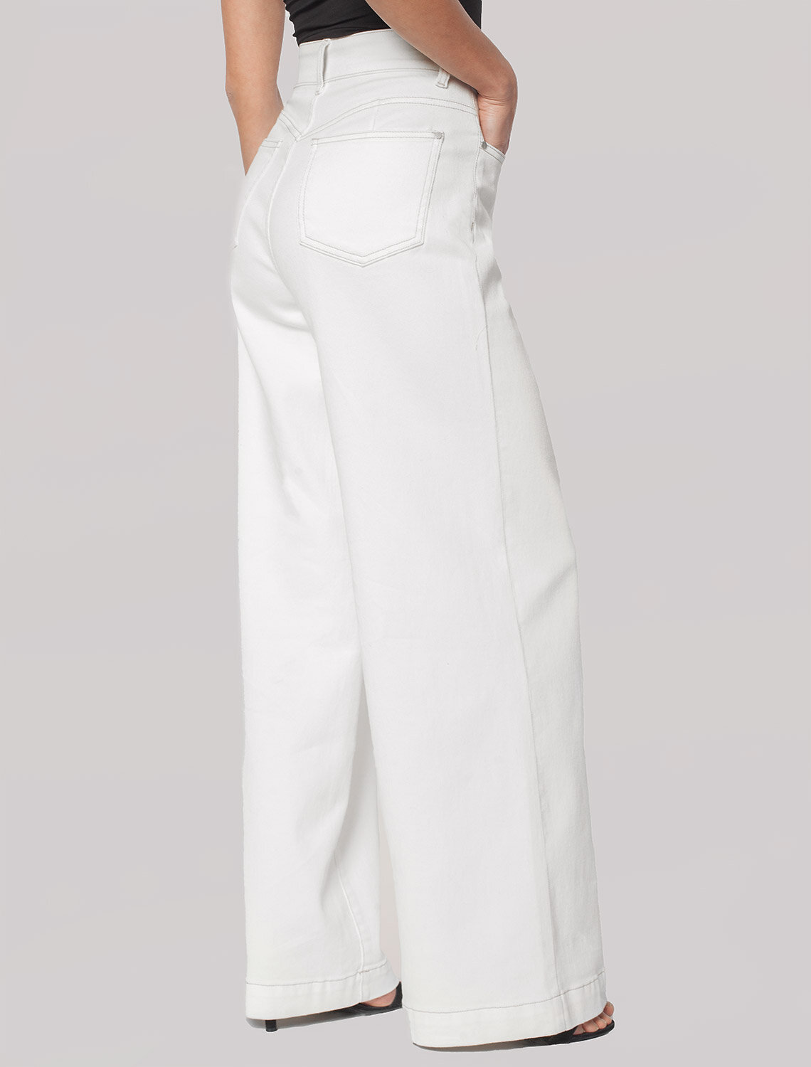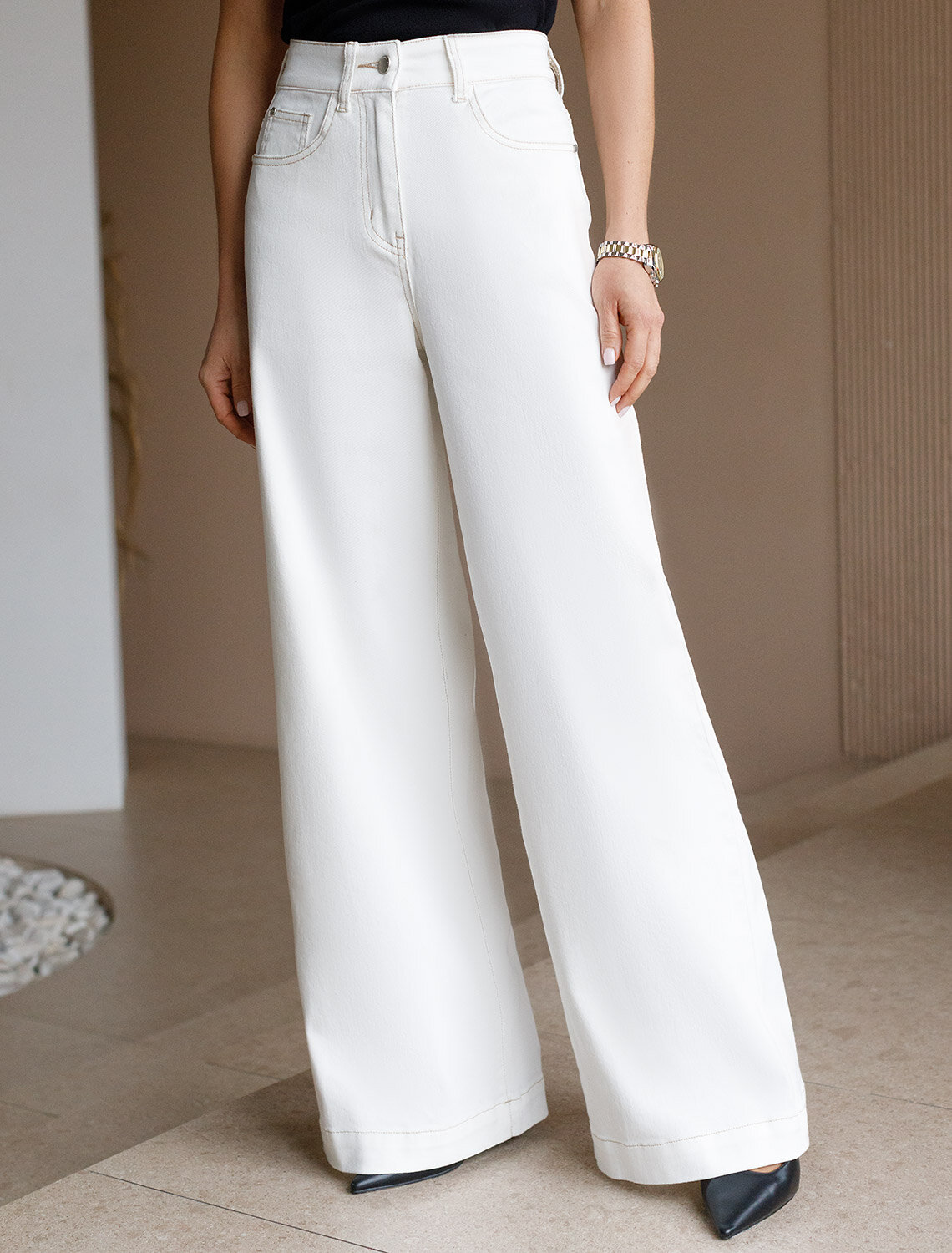 Джинсы-трубы выполнены из эластичного денима. Модель в теплом белом оттенке дополнена контрастными бежевыми строчками. Посадка на талии и свободный крой подчеркивают фигуру и вытягивают силуэт. Изделие дополнено фирменным патчем.