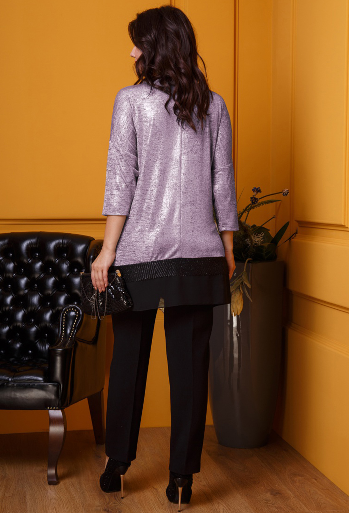 Комплект женский 2-х предметный: туника, брюки. Туника из трикотажного полотна, сетки, шифона, с пайетками на подкладке. Брюки из текстильной ткани "елочка". Туника расширена к низу. По переду туники -кокетка из сетки, на которой наклеены черные стразы. По низу туники - отрезная узкая бейка из пайеток на подкладке. Рукав цельнокроеный, втачной, длиной 3/4. Низ рукава и горловина спинки подшиты на распошивалке. Горловина переда окантована. По низу туники-полоска из шифона с углами по боковым швам. Низ полоски и углы обметаны на "улитке". Брюки заужены к низу, в верху на широкой обтачке. По переду - застежка на молнию и на 2-е петли и 2-е пуговицы. На задних половинках брюк-талиевые вытачки. Длина туники-82см; длина рукава-48см; длина брюк-102см.