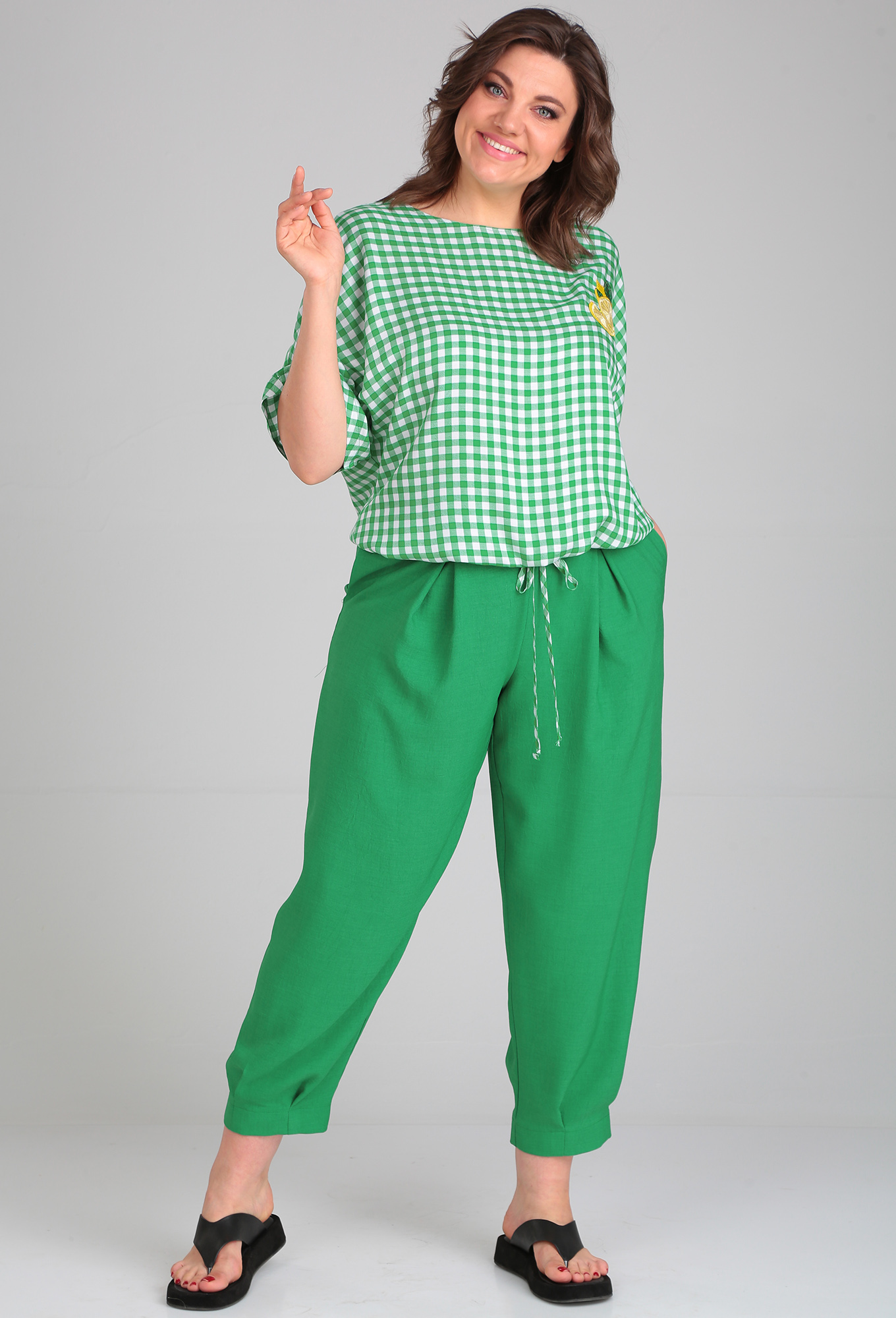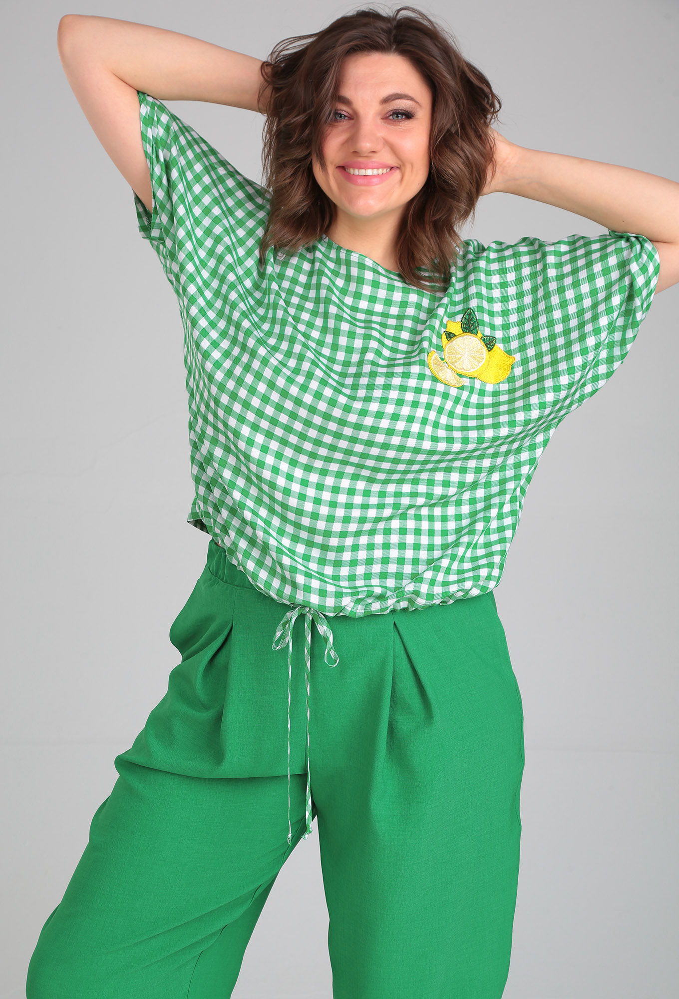 Комфортный летний брючный комплект для повседневной носки. Брюки-шаровары из легкой ткани — лен-вишер, которая хорошо держит форму, длиной 7/8, с поясом на резинке и боковыми карманами. Укороченный блузон свободного кроя из натуральной приятной на ощупь вискозы, имеет кулиску по низу изделия, которой можно регулировать плотность прилегания. Цельнокроеный рукав, округлая горловина. По переду блузона в качестве декора аппликация «лимон» (может отличаться от студийного фото). Комплект отлично сочетается с любой по стилю обувью, он прекрасно вольется в Ваш гардероб, благодаря своей универсальности.