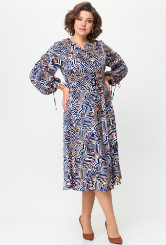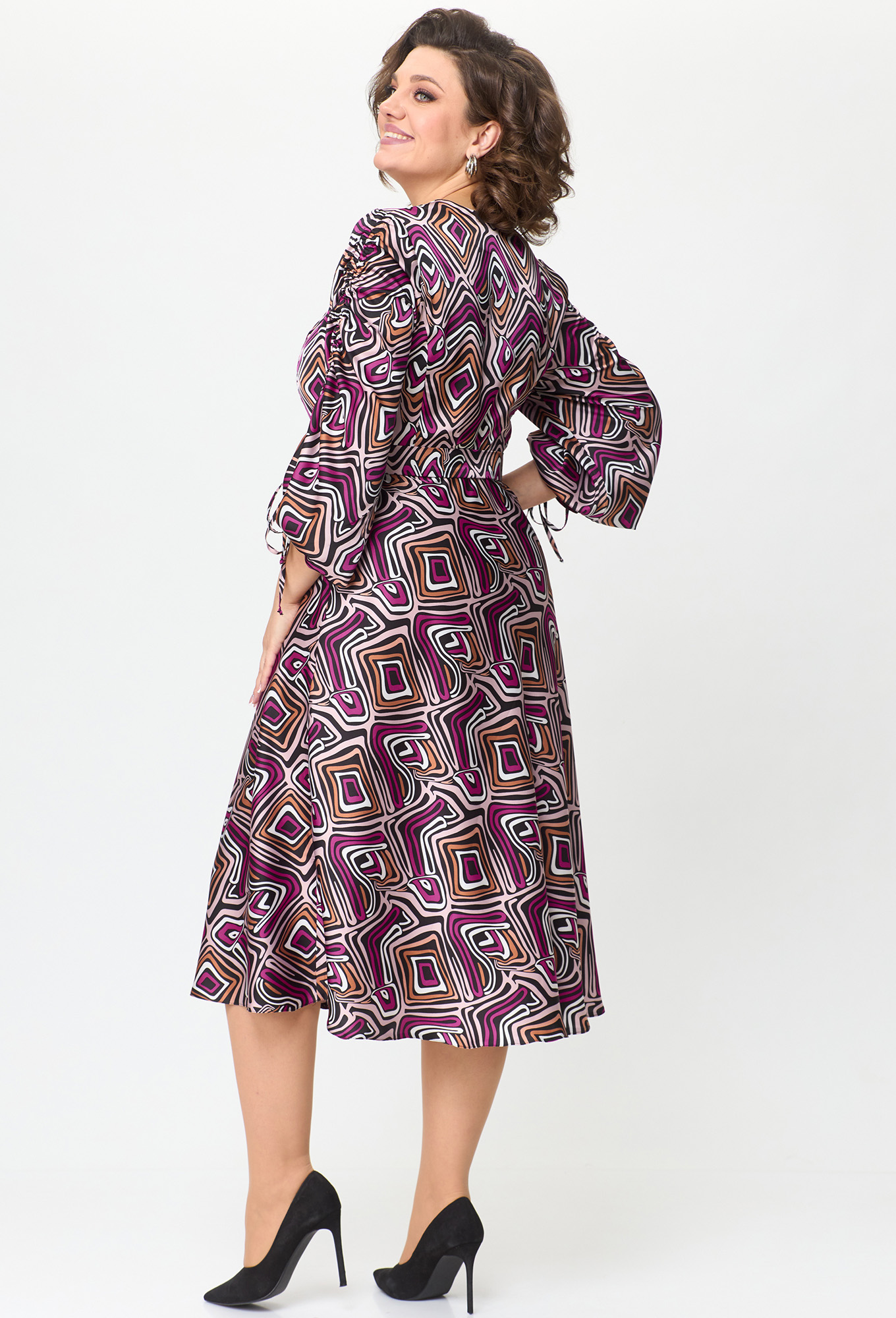 Платье длиной за колено, выполнено из ткани с набивным рисунком. Лиф платья отрезной по линии талии. Полочка лифа с вертикальными рельефами, супатной застежкой по центру. Горловина круглой формы. Спинка лифа с вертикальными рельефами. Юбка лифа притачная, А-образного силуэта. В левом боковом шве обработана потайная молния. По боковым швам в области талии настрочены шлевки, через которые продет пояс с пряжкой. Рукав втачной, двухшовный, по низу на притачной манжете. По верхнему шву рукава обработана кулиса.