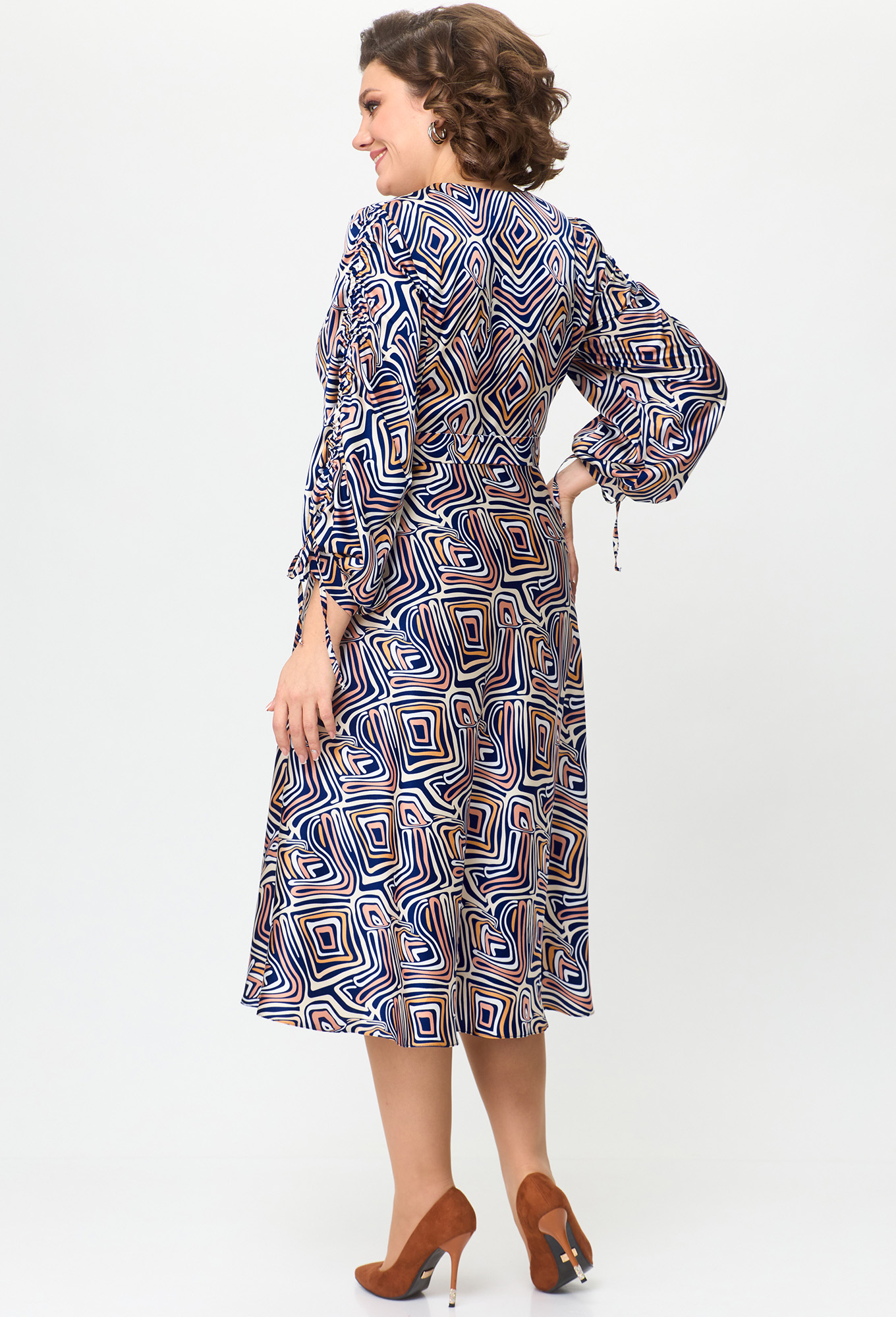 Платье длиной за колено, выполнено из ткани с набивным рисунком. Лиф платья отрезной по линии талии. Полочка лифа с вертикальными рельефами, супатной застежкой по центру. Горловина круглой формы. Спинка лифа с вертикальными рельефами. Юбка лифа притачная, А-образного силуэта. В левом боковом шве обработана потайная молния. По боковым швам в области талии настрочены шлевки, через которые продет пояс с пряжкой. Рукав втачной, двухшовный, по низу на притачной манжете. По верхнему шву рукава обработана кулиса.