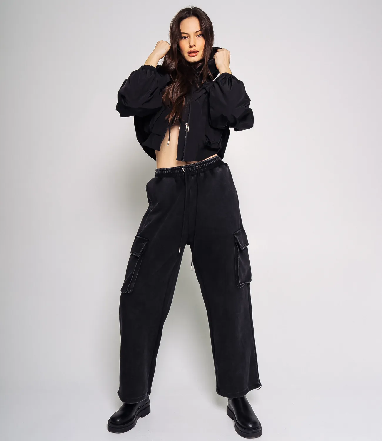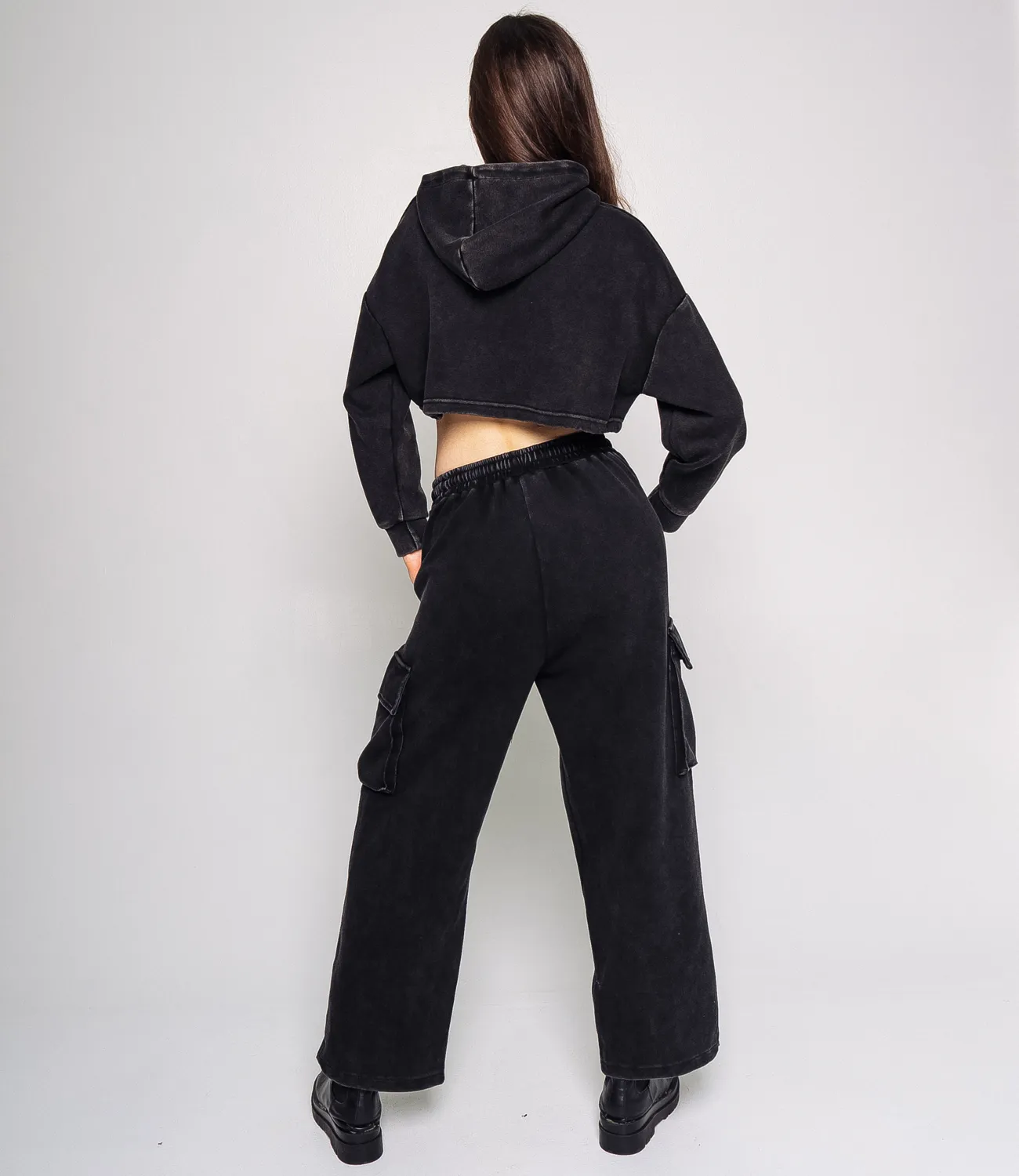 Хлопковый спортивный костюм отличное решение для занятия спортом или просто прогулки. Укороченная кофта с капюшоном и брюки карго отлично дополняют друг друга и дарят комфорт.