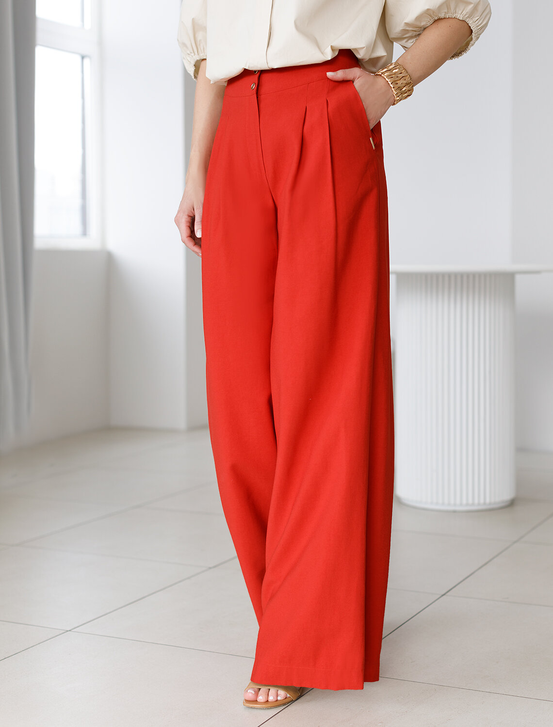 Брюки выполнены из плотного лиоцелла. Модель дополнена карманами и высоким поясом на пуговицах. Ткань изделия отлично держит форму, плавно драпируется и не просвечивает. В теплое время года приятно охлаждает кожу. Добавление синтетических волокон в составе изделия, предотвращает сминаемостьи поддерживает формоустойчивость. Брюки сочетаются в костюме с топом D23.063 и блузкой D29.266, D29.267 и жилетом D27.002