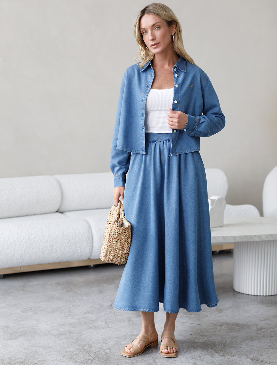 Юбка полусолнце выполнена из лиоцелла. Сзади застежка на потайную молнию. Ткань с характерным атласным блеском полностью имитирует обычный деним, но в тоже время намного более мягкая, плавно струится по телу, хорошо драпируется и охлаждает кожу в жаркое время года. Изделие сочетается в костюме с блузкой D59.017