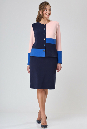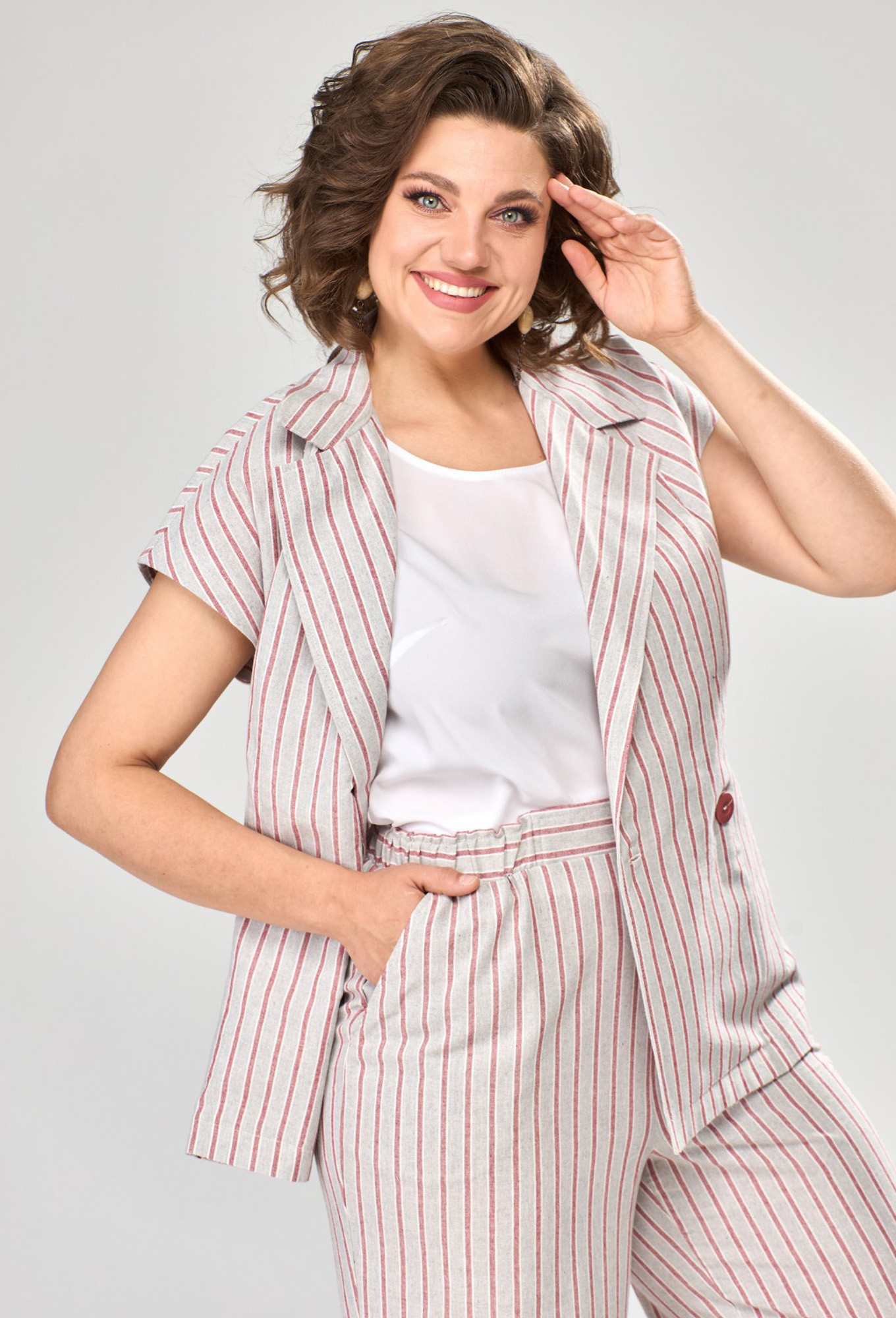Костюм состоит из жакета и брюк, выполнен из ткани в полоску. Жакет полуприлегающего силуэта, длинной чуть ниже линии бёдер. Жакет с двубортной открытой застёжкой на один ряд петель и пуговиц и воротником пиджачного тип. Полочка и спинка с рельефами от плечевого шва. Рукава цельнокроеные, короткие. Брюки прямые, длинные, свободные в верхней части, со стрелками. По передним половинкам выполнены карманы. Брюки на приталенном поясе с эластичной тесьмой и завязками спереди
