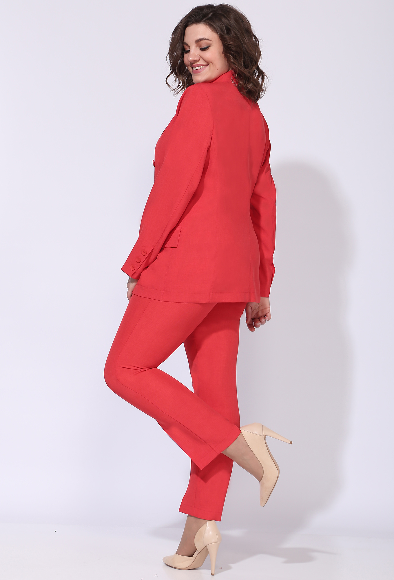 Костюм выполнен из однотонной ткани. Жакет прямого силуэта, без подклада. Перед жакета с вертикальными вытачками, двубортной застежкой на петли и пуговицы и прорезными карманами с клапанами. Жакет с отрезным бочком без бокового шва. Горловина V – образной формы, с отложными лацканами и воротником пиджачного типа. Спинка со средним швом. Рукав втачной, длинный, двухшовный, со шлицей.