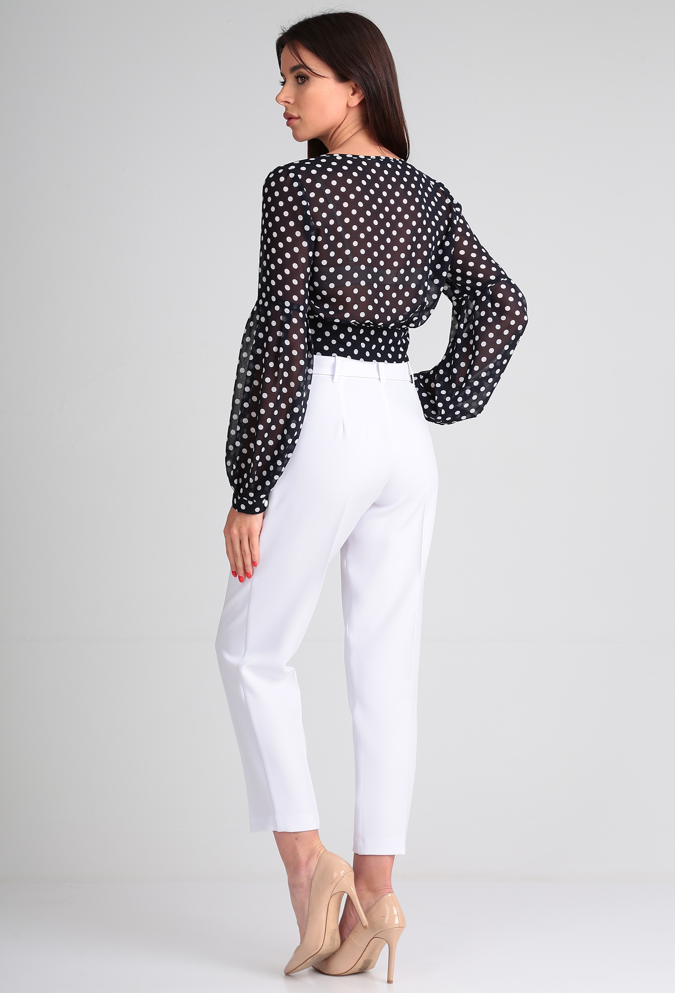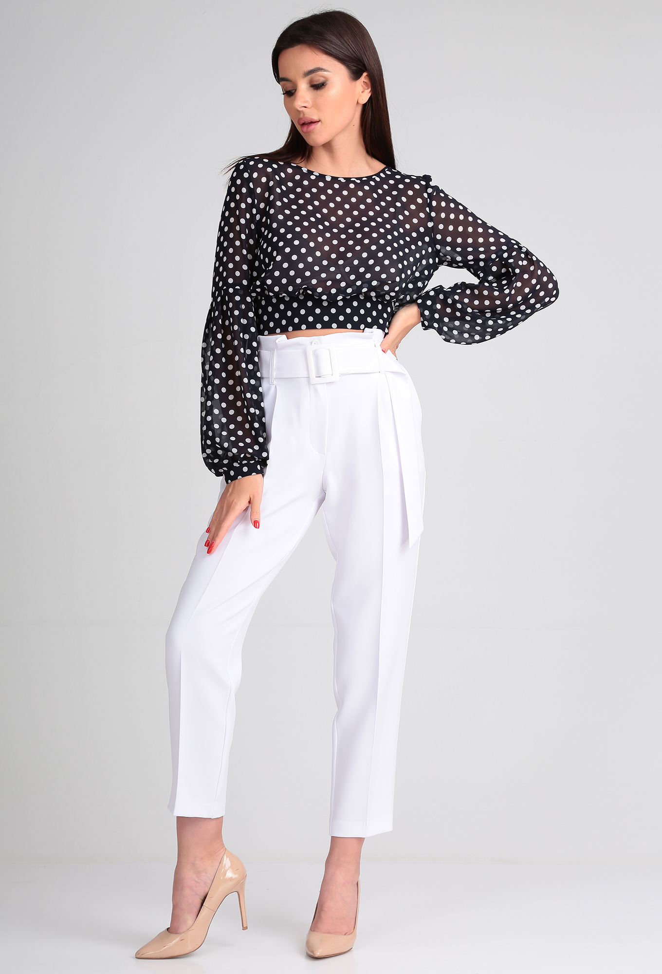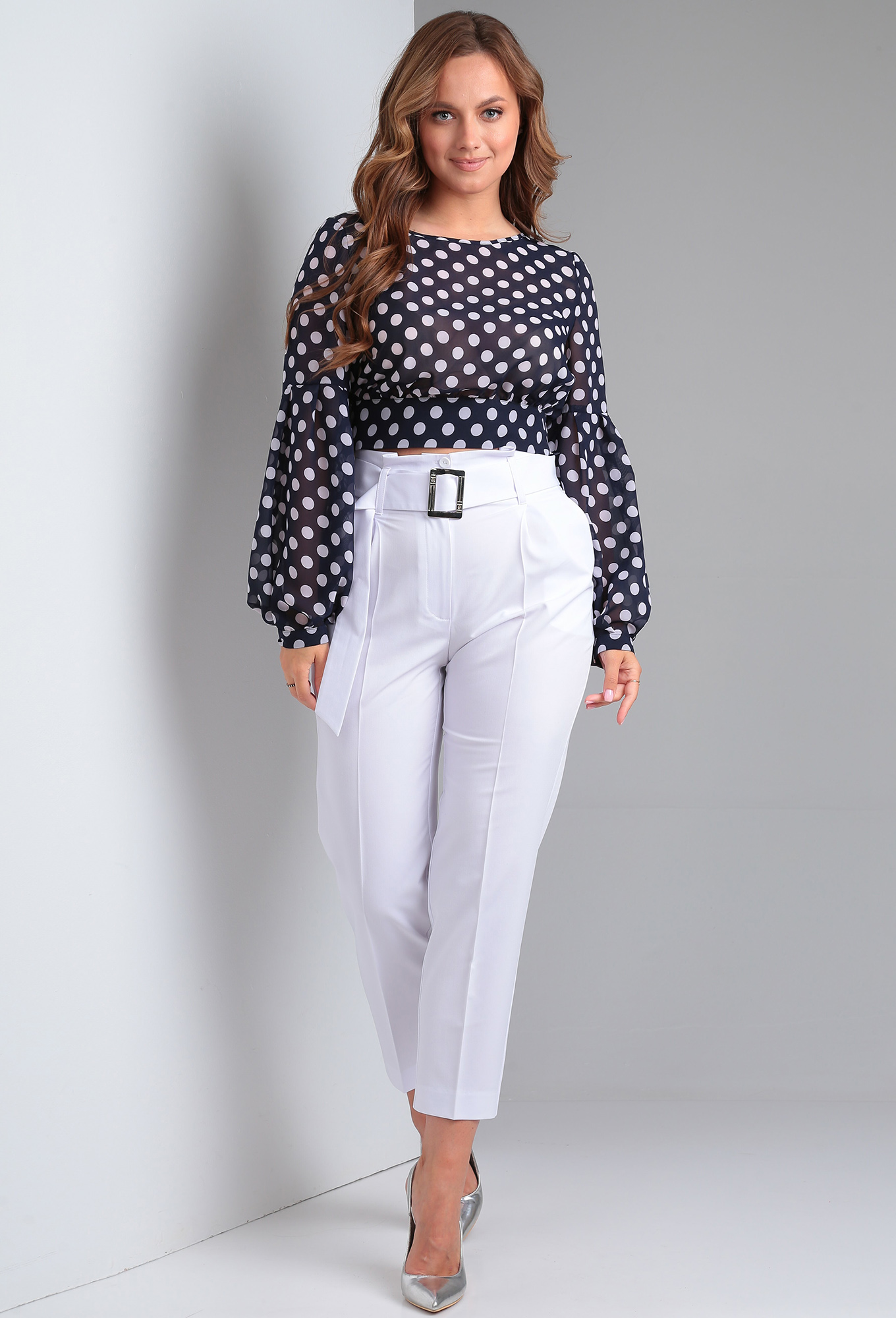 Комплект 2х предметный, состоит из блузки и брюк. Блузка укорочена до центра линии талии, низ блузки на широком поясе и с застёжкой в левом боковом шве на молнию