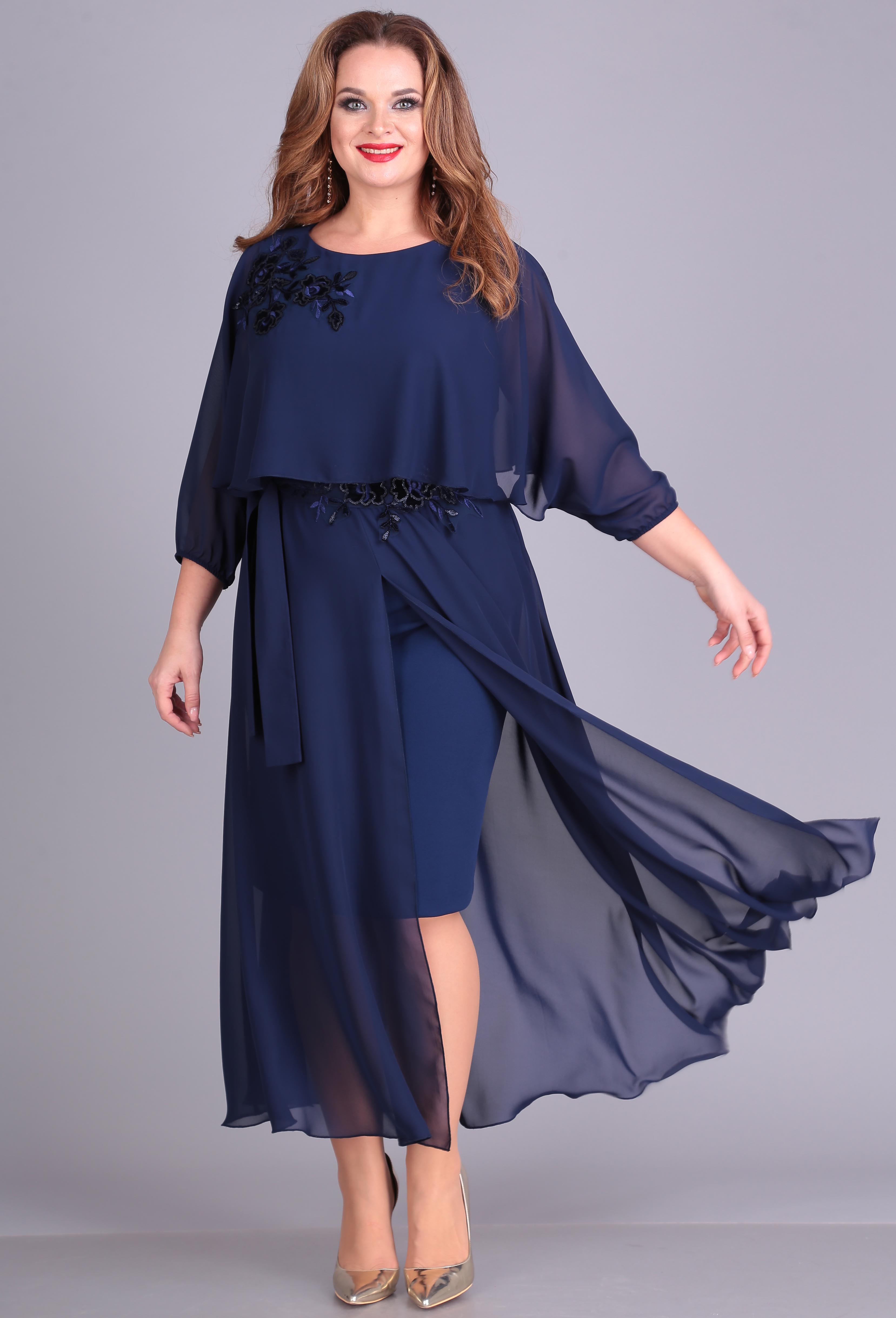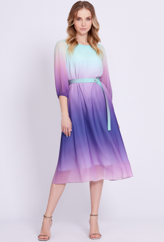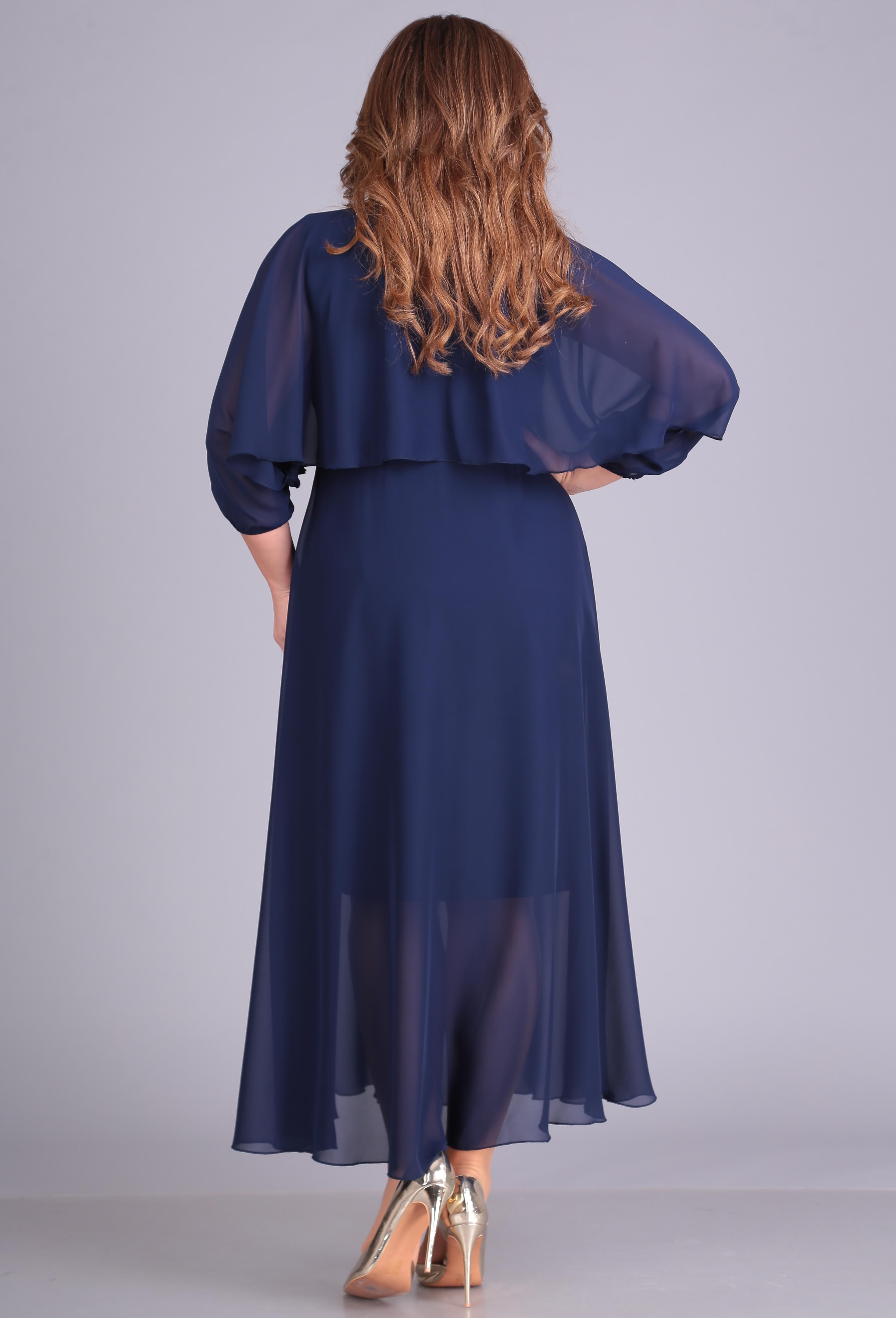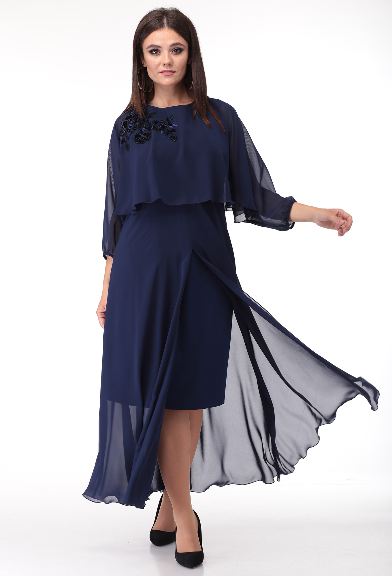 Платье длиной чуть ниже колена, двухслойное. Платье выполнено из трикотажного однотонного полотна, однотонного шифона и элементов гипюра (вышивка на сетке). Верхняя часть платья двухслойная, лиф-основа с нагрудными вытачками, выходящими от шва притачивания к юбке. Отрезная фигурная асимметричная кокетка в верхней части полочки с наложением гипюра на трикотажное полотно. Рукав втачной, одношовный, слегка ниже линии локтя. Горловина круглой формы. Нижняя часть платья - юбка, притачная, двухслойная. Передняя часть юбки-основы с талиевыми вытачками, задняя часть юбки-основы также с талиевыми вытачками и средним швом, в нижней части которого обработан разрез. Верхняя часть юбки асимметричной формы, выполнена из шифона. Потайная молния обработана в левом боковом шве.