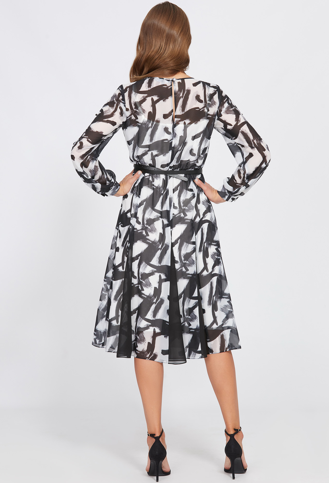 Это изящное платье миди Х- образного силуэта поможет почувствовать себя элегантной и утончённой. Округлый вырез со сборкой по переду придаёт платью изысканный вид, а замысловатые рукава, собранные по низу манжетами с застежкой на петлю-пуговицу и украшены нежными бусинками, и великолепная струящая юбка с контрастными вставками добавляют изюминку. Для удобства в эксплуатации, в среднем шве спинки обработана застежка на навесную петлю и пуговицу. Модель выполнили из мягкого струящего шифона с абстрактным принтом. Платье комплектуется с нижним платьем из приятной 100 % вискозной ткани. Завершает модель пояс-ремень с пряжкой. Ремень может отличаться от студийного фото.