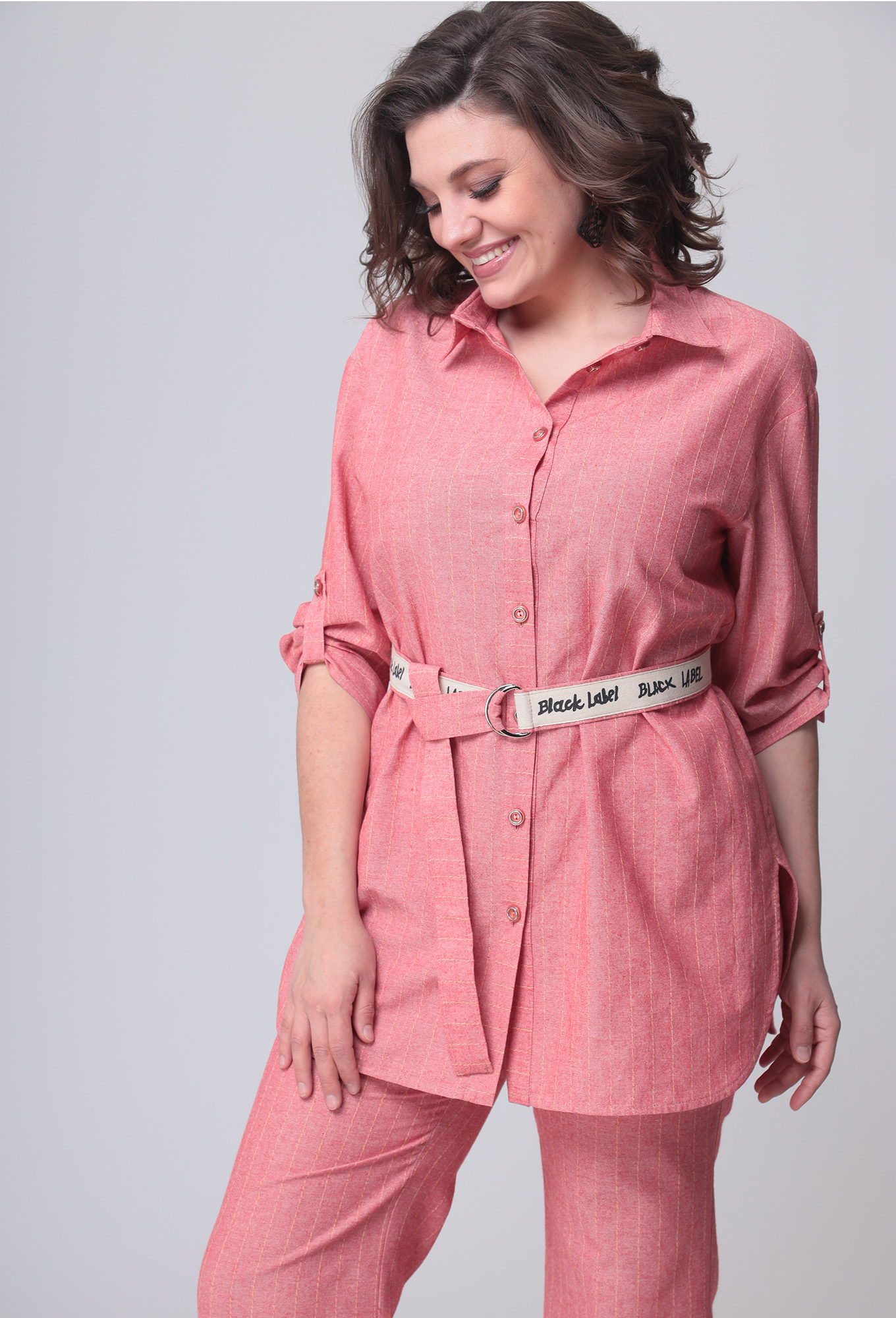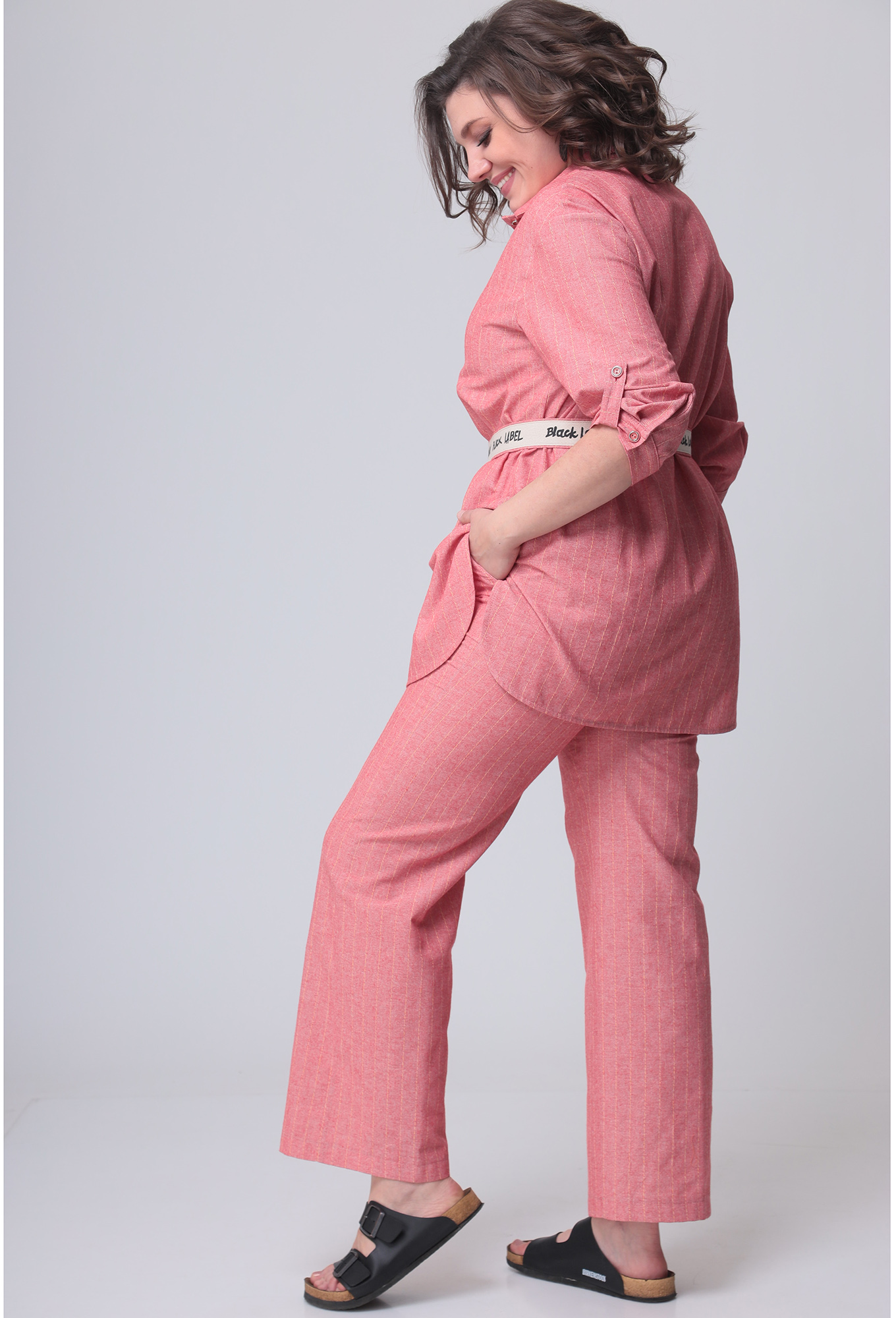 Костюм состоящий из блузки и брюк, выполнен из пестротканой ткани в полоску. Блузка прямого свободного силуэта. Полочка блузки с центральной застежкой на петли и пуговицы по притачной планке. Горловина круглой формы, обработана притачной стойкой с воротником рубашечного типа. Пройма блузки углубленной формы, рукав рубашечного типа, длиной ¾. По низу рукав обработан притачной манжетой с застежкой на петлю и пуговицу. В нижней части рукава по центру обработана пата, крепящаяся к рукаву пуговицей. Спинка цельная, низ блузки в области боковых швов закруглен. Брюки прямого силуэта, полуприлегающие в области бедер и свободные в колене и по низу. По передним половинкам обработаны наклонные карманы и застежка в среднем шве на молнию. По задним половинкам обработаны талиевые вытачки. Брюки на притачном поясе с эластичной тесьмой и застежкой на петлю и пуговицу.