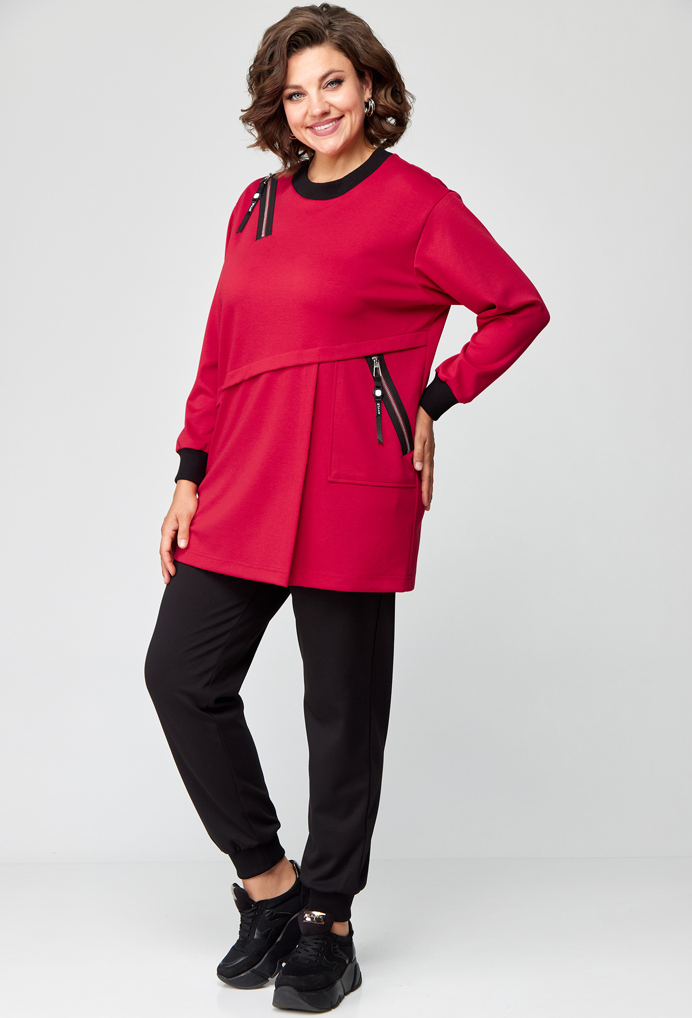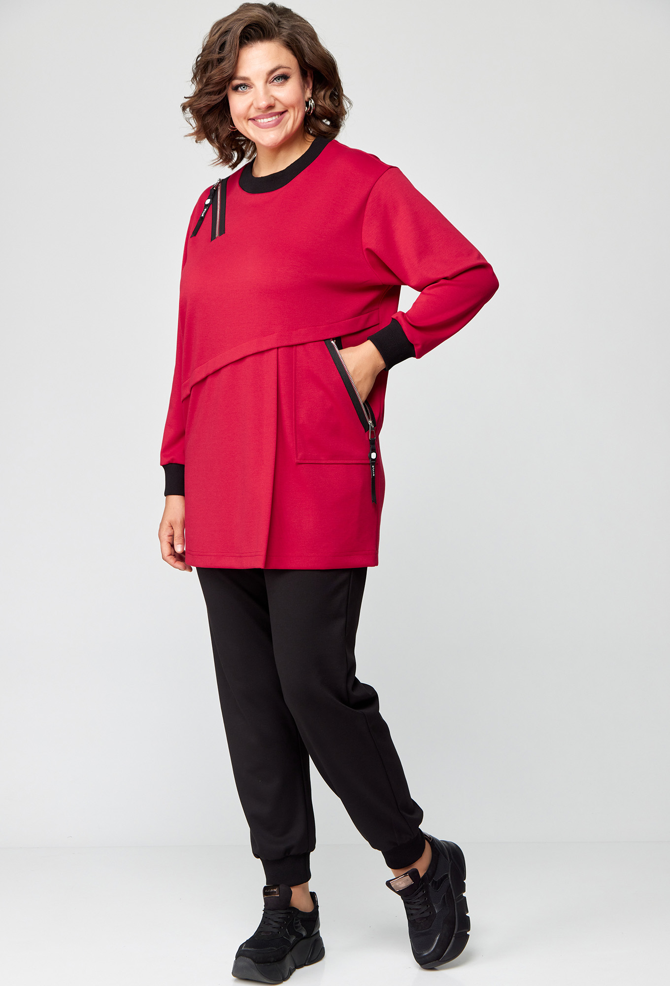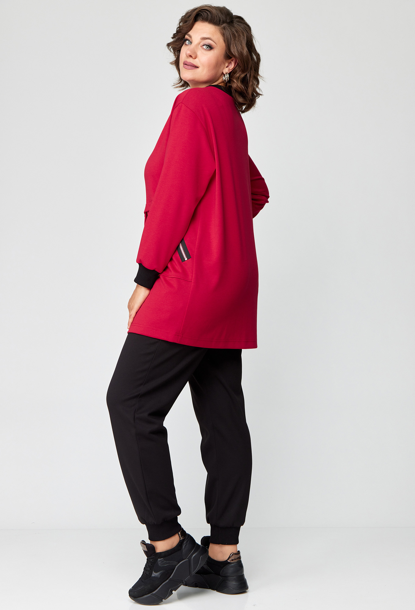 Костюм состоящий из джемпера и брюк выполнен из однотонного трикотажного полотна в двух контрастных цветах.